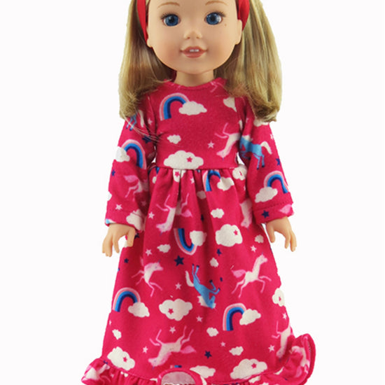 Your doll will be dreaming of unicorns and rainbows while falling asleep in this pretty pink nightgown.