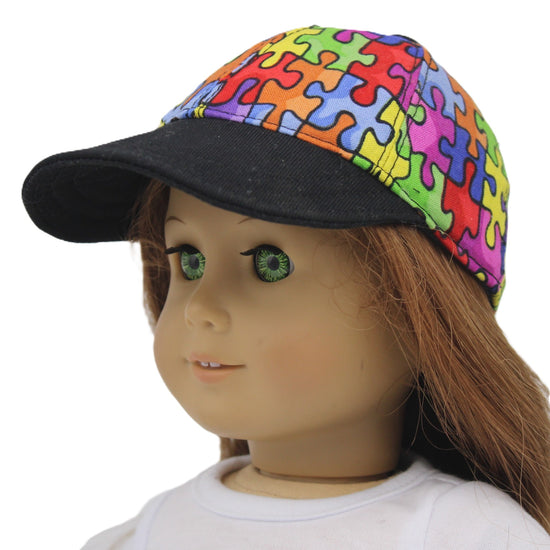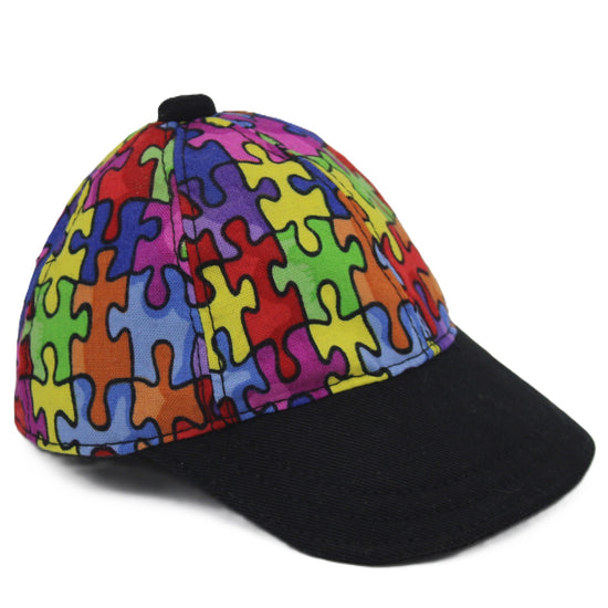 Jigsaw puzzle print baseball/softball cap with black brim.