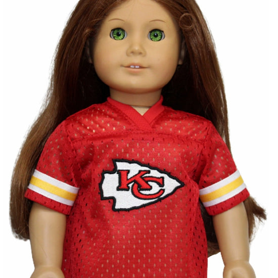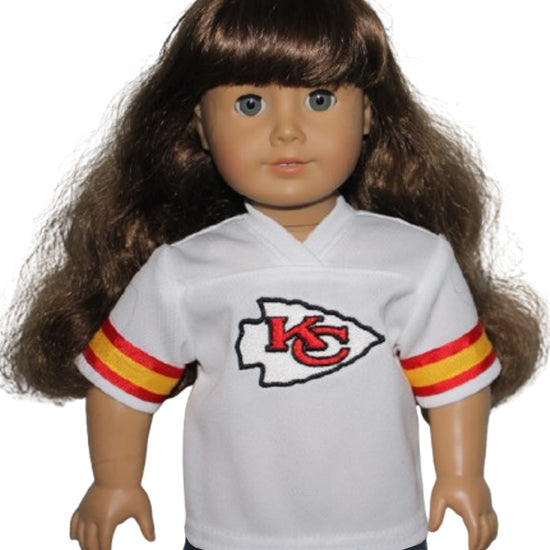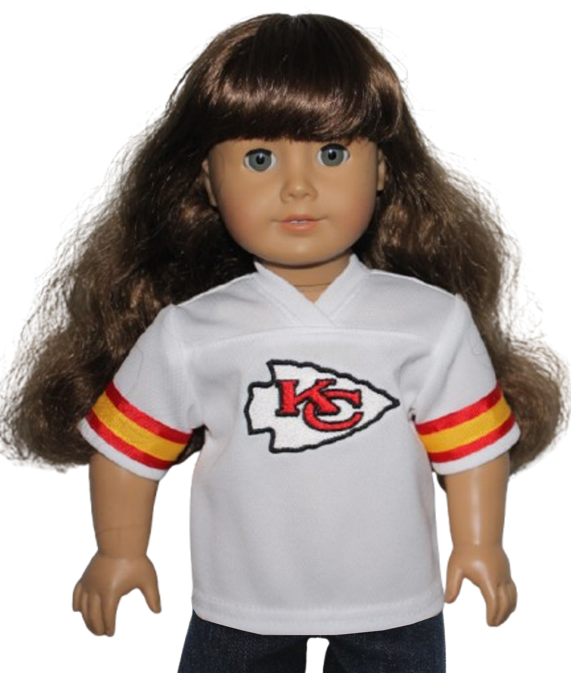 Show your little fan’s team spirit with this playful Kansas City Chiefs-inspired doll jersey. Featuring the iconic logo embroidered on the front, it’s the perfect outfit to cheer on game day or add a sporty touch to everyday doll play. Designed to fit American Girl dolls, this jersey brings the excitement of football right to your child’s favorite companion.