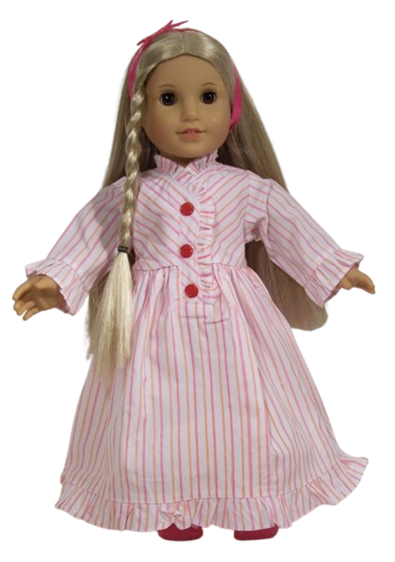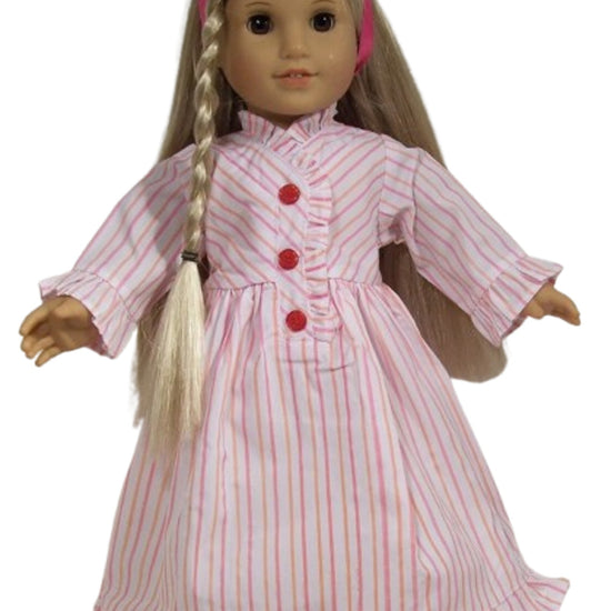 Kit inspired reproduction nightgown features a stripe print and ruffles at the hem, cuffs and yoke.