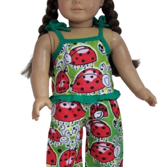 These ladybug print flannel pajamas come in a comfortable 2-piece set designed for dolls. Soft and cozy, they’re charming enough to be worn as a playful outfit as well.