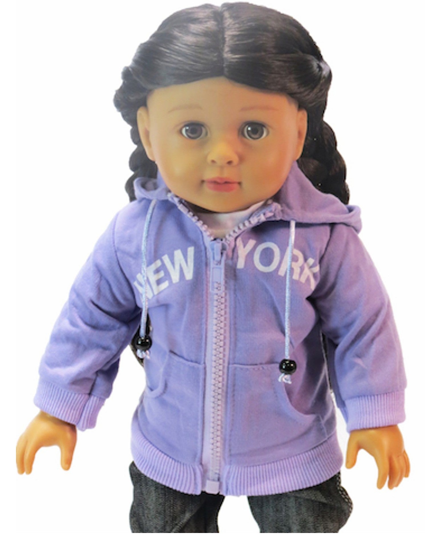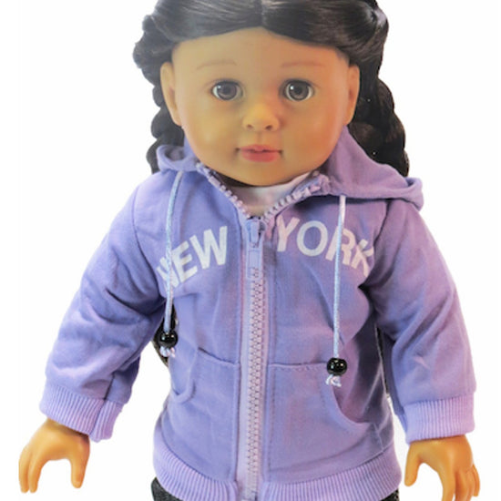Lavender purple "New York" hoodie with pockets closes with a zipper.
