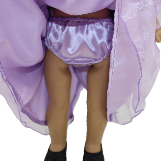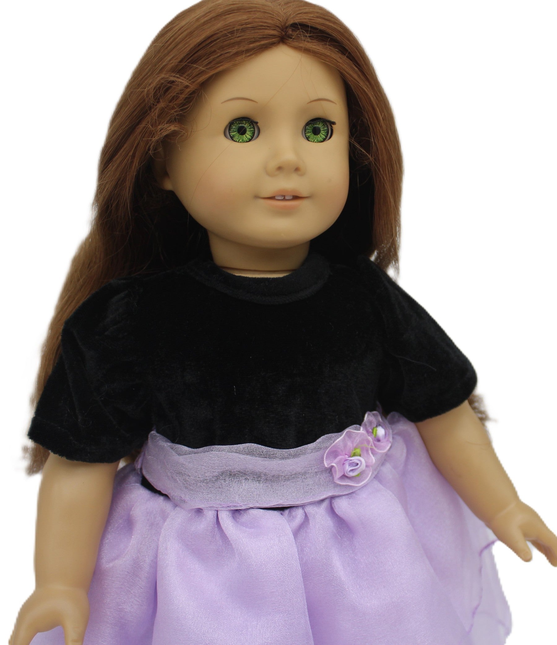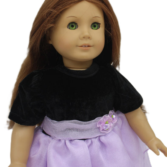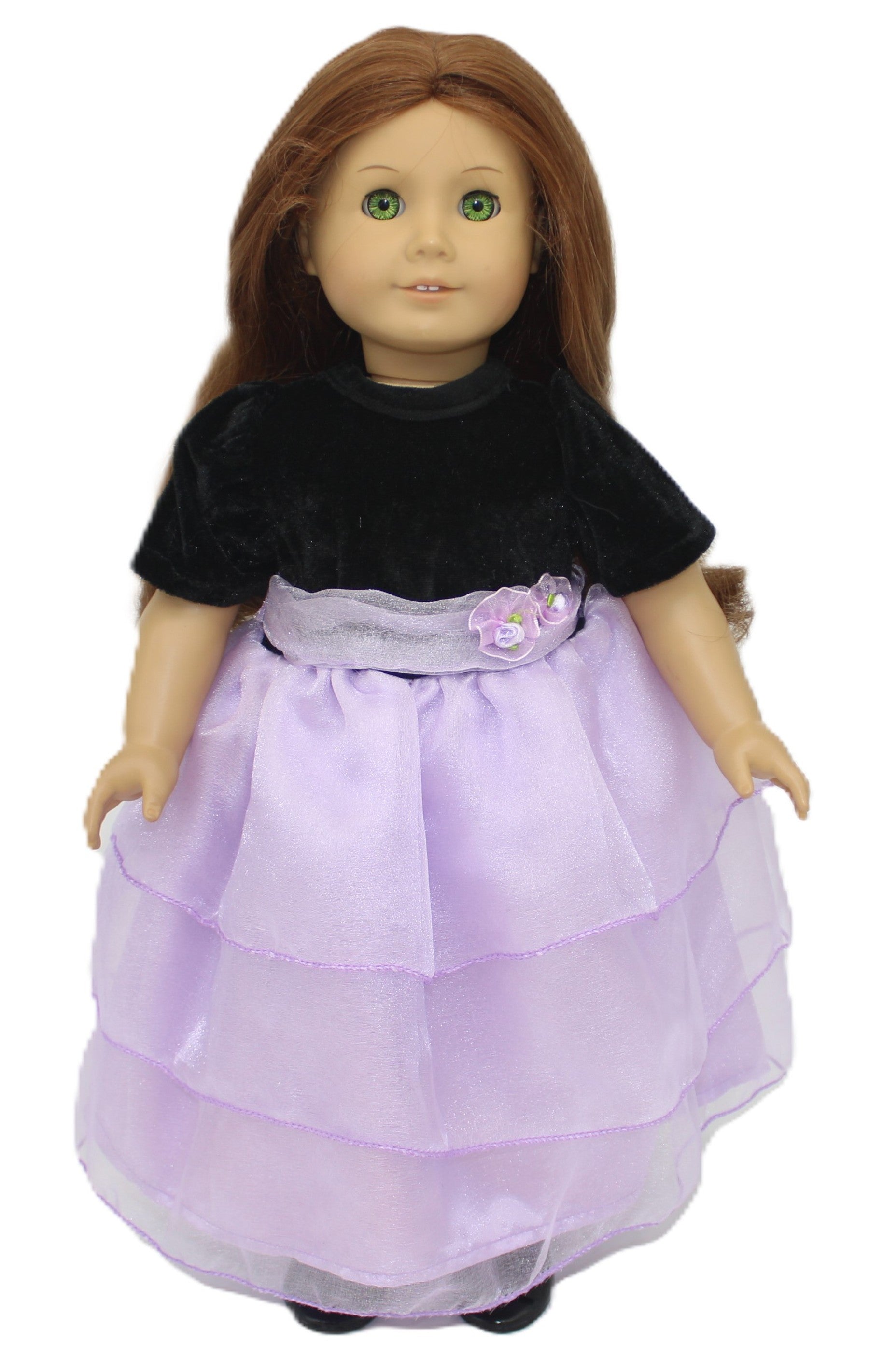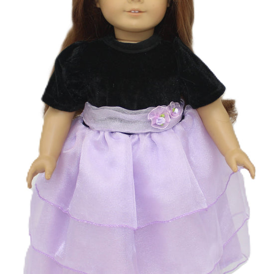 Lavender party dress with tiered skirt and black velveteen bodice. Matching lavender panties are included.