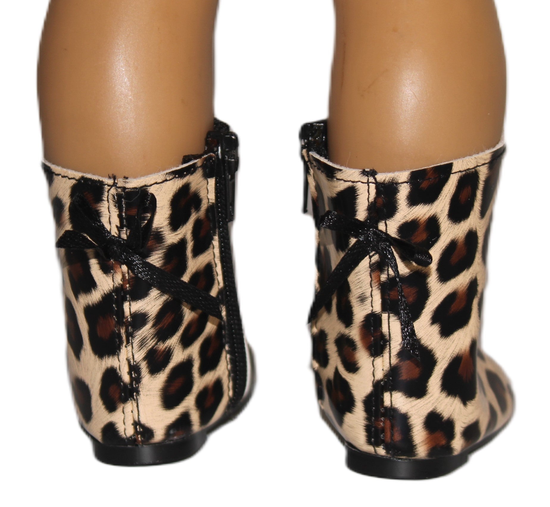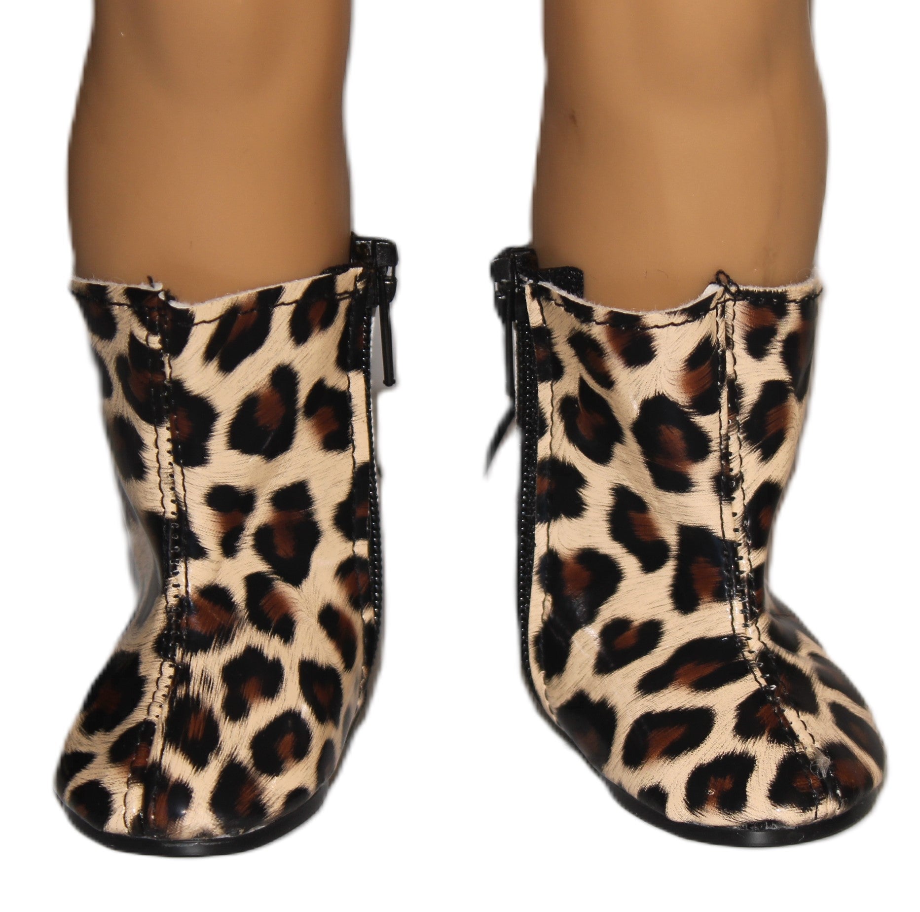 Short leopard print vinyl boots close with zippers.