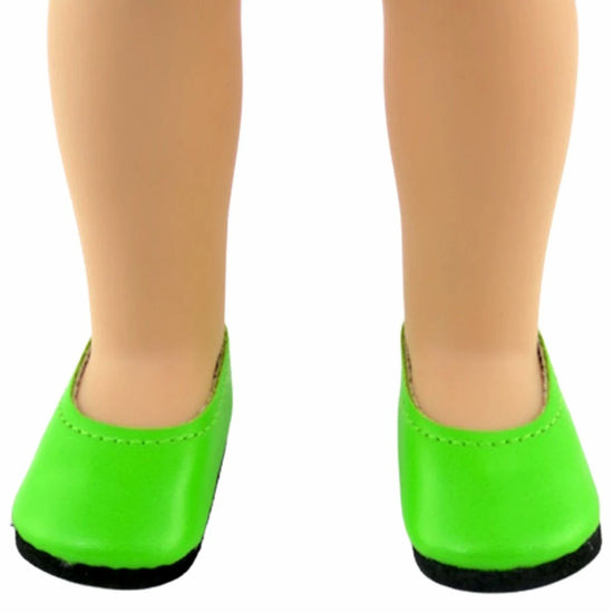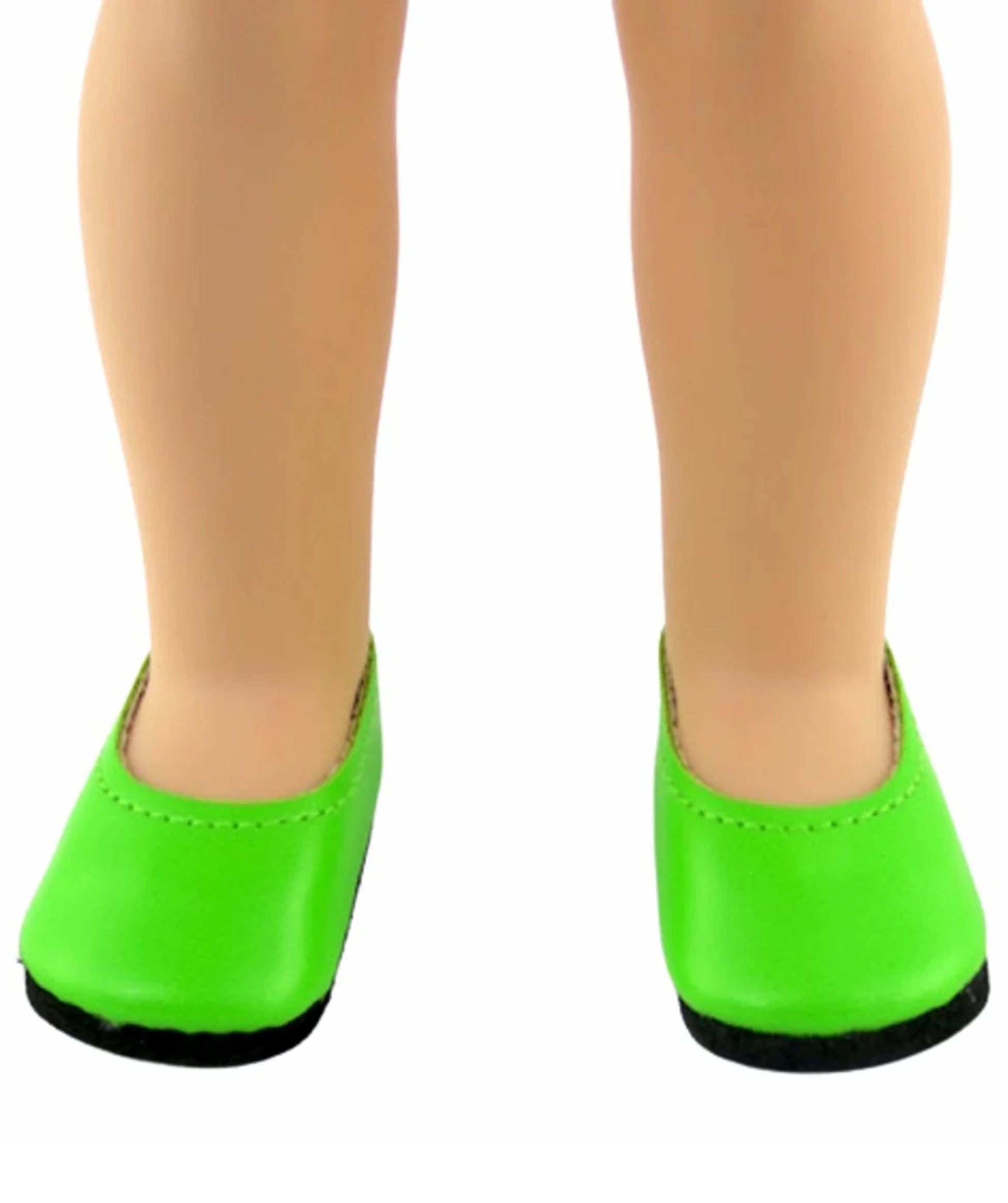 Lime green slip-on ballet flats designed for 14" WellieWishers dolls. These cheerful flats feature a classic silhouette perfect for everyday doll outfits and special occasions. The slip-on style makes dressing your doll quick and easy, while the soft construction ensures a comfortable fit. Pair them with any outfit in your doll's wardrobe for a polished, coordinated look.