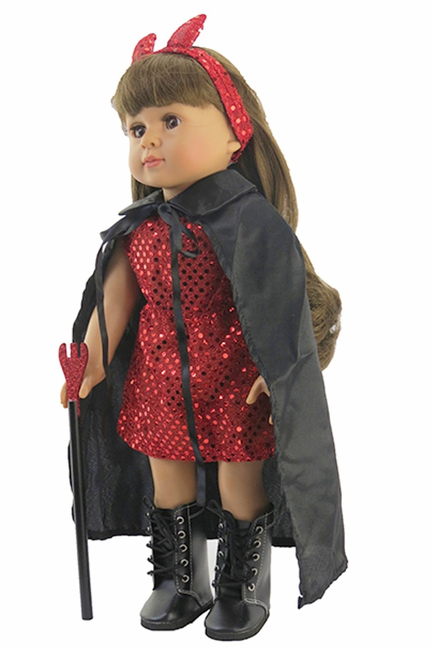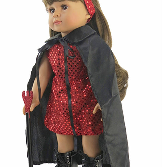 Little Devil costume includes sequin red dress & headband, “pitchfork”, black cape and faux leather boots.
