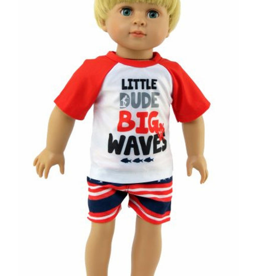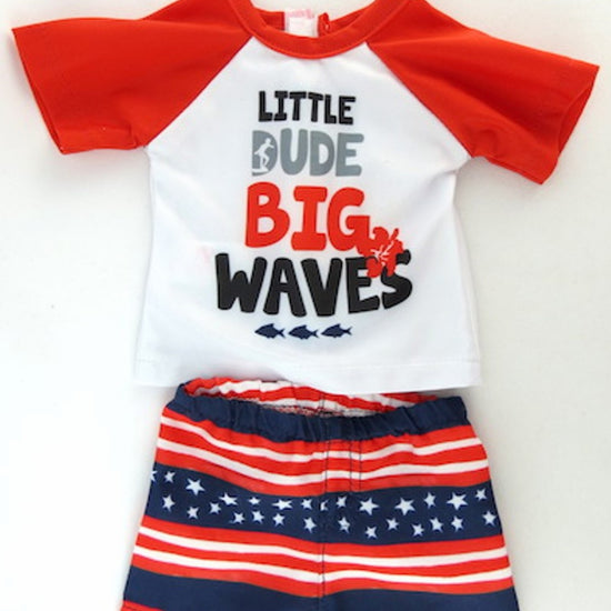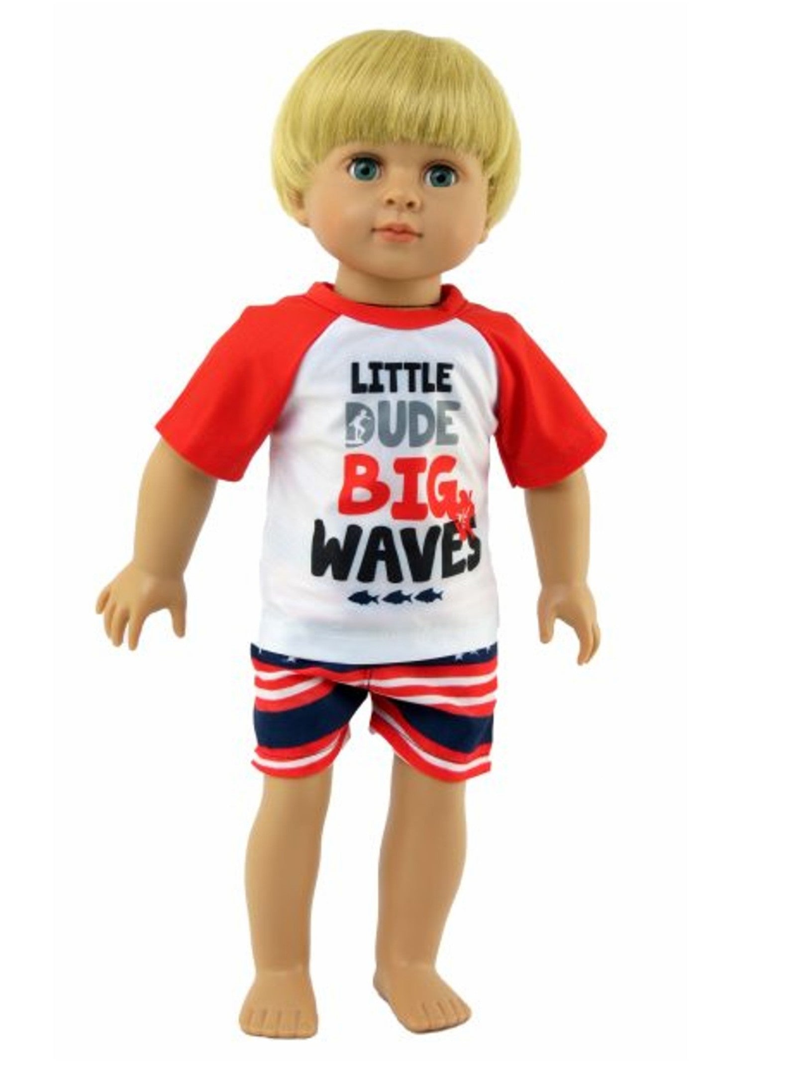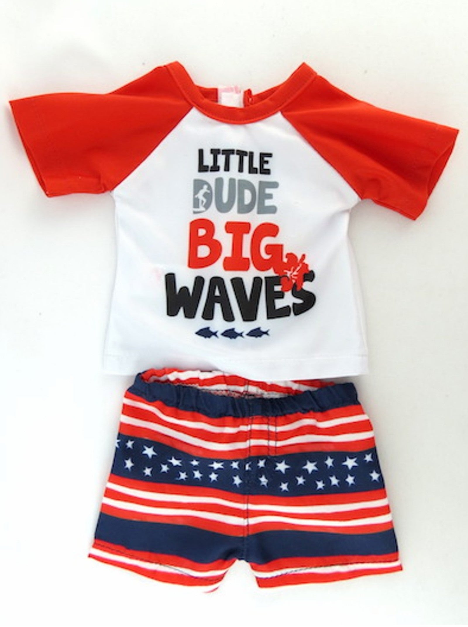 "Little Firecracker" white and red tee shirt and striped board shorts.