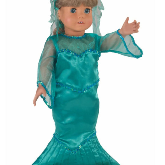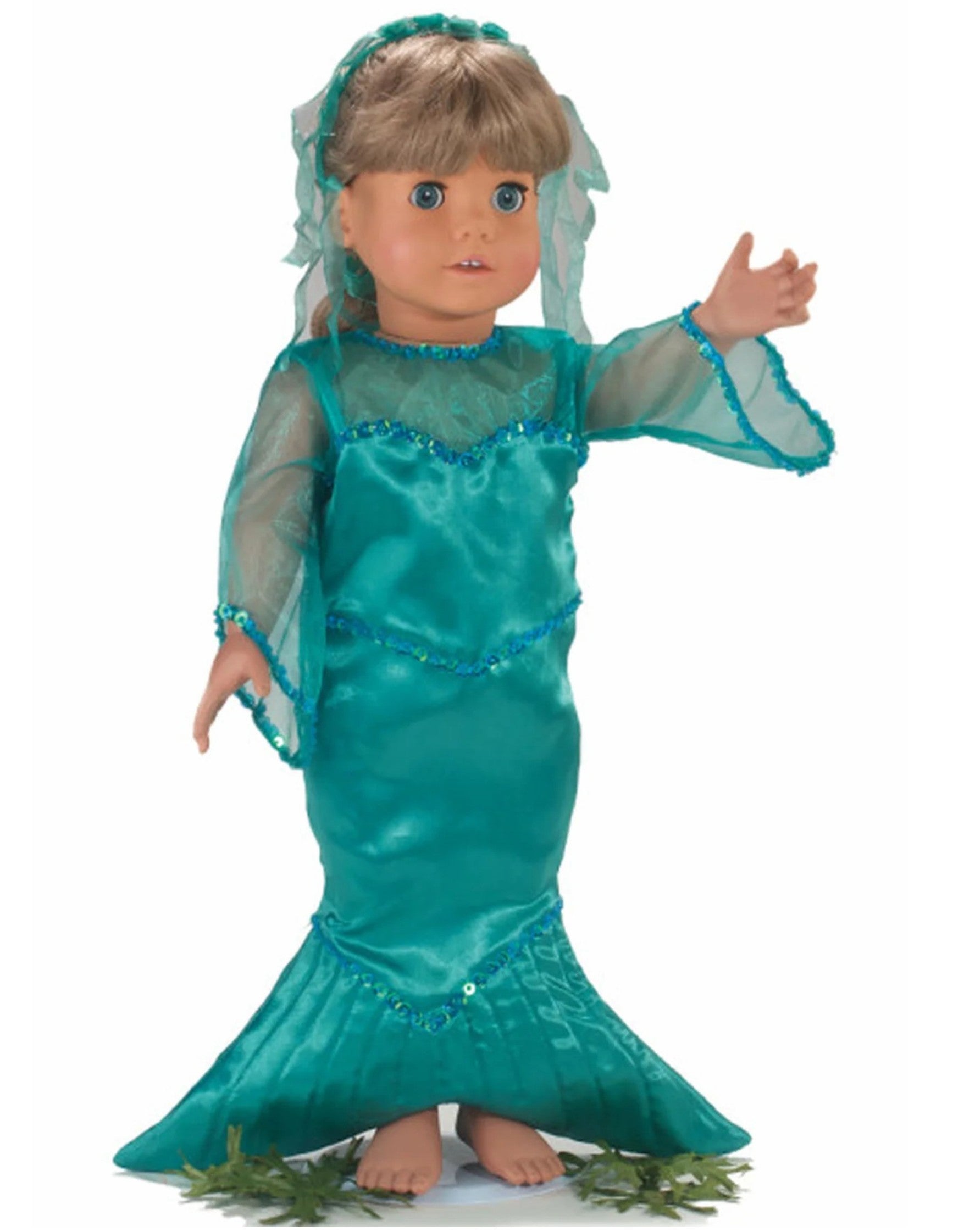 Mermaid doll outfit set includes one fit-and-flare turquoise gown and matching headband.