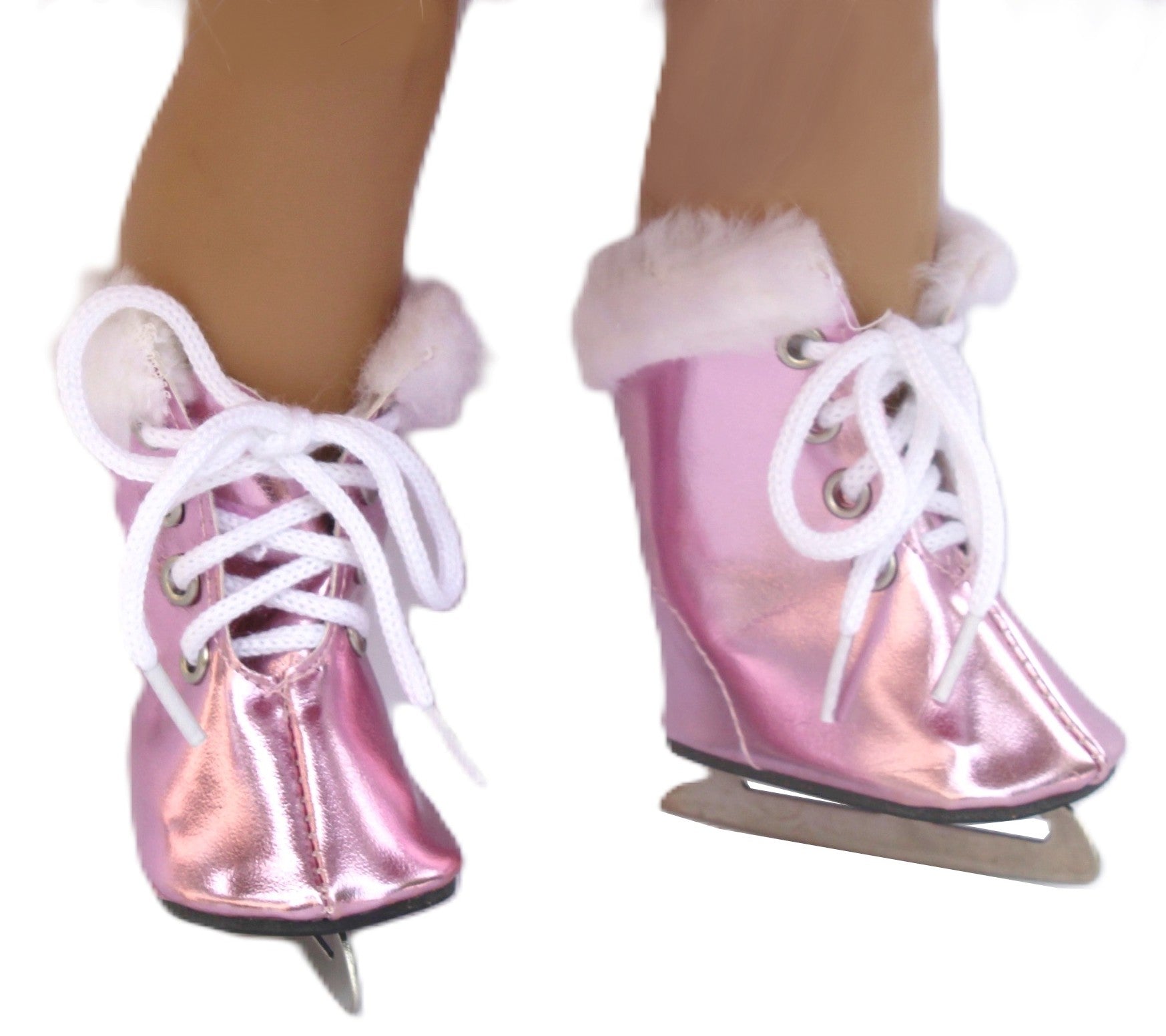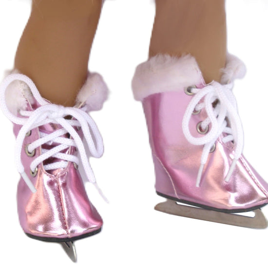 Metallic pink ice skates with faux fur trim.