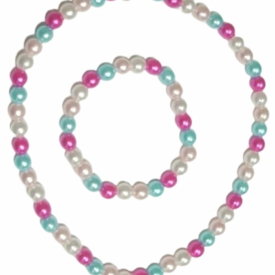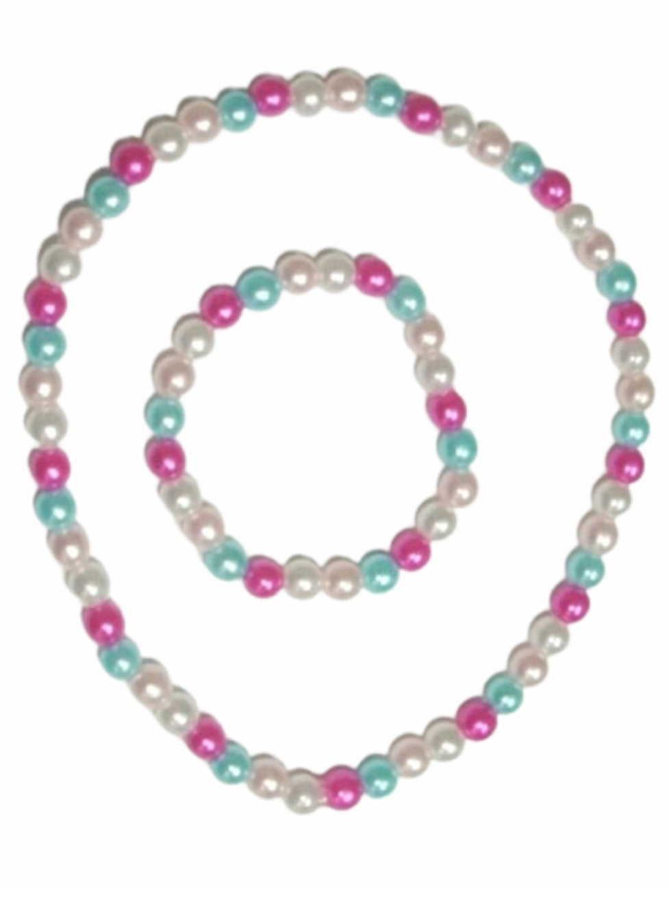 Faux multi-colored pearl necklace and bracelet on stretchy cords.