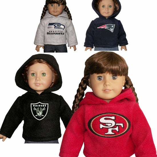 Keep your doll cozy and game-ready with this pullover hooded fleece top! Featuring long sleeves and a fun embroidered logo, it fully opens in the back for easy dressing. Choose your favorite NFL team and color to show off team pride in style—each hoodie is made to order just for your doll’s winning look.