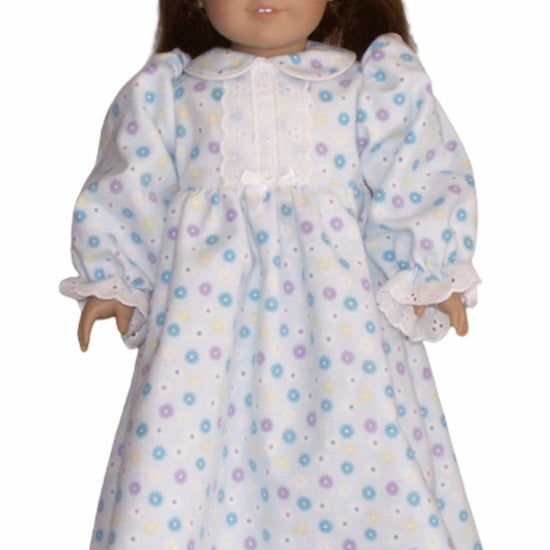 This charming nightgown for American Girl dolls features delicate white lace trimming the bodice front and sleeve hems, adding a touch of sweetness. With a full gathered skirt, it’s perfect for twirling during bedtime stories. The back fastens easily with Velcro, making dressing your doll quick and fuss-free. Sweet dreams await in this cozy, playful outfit!