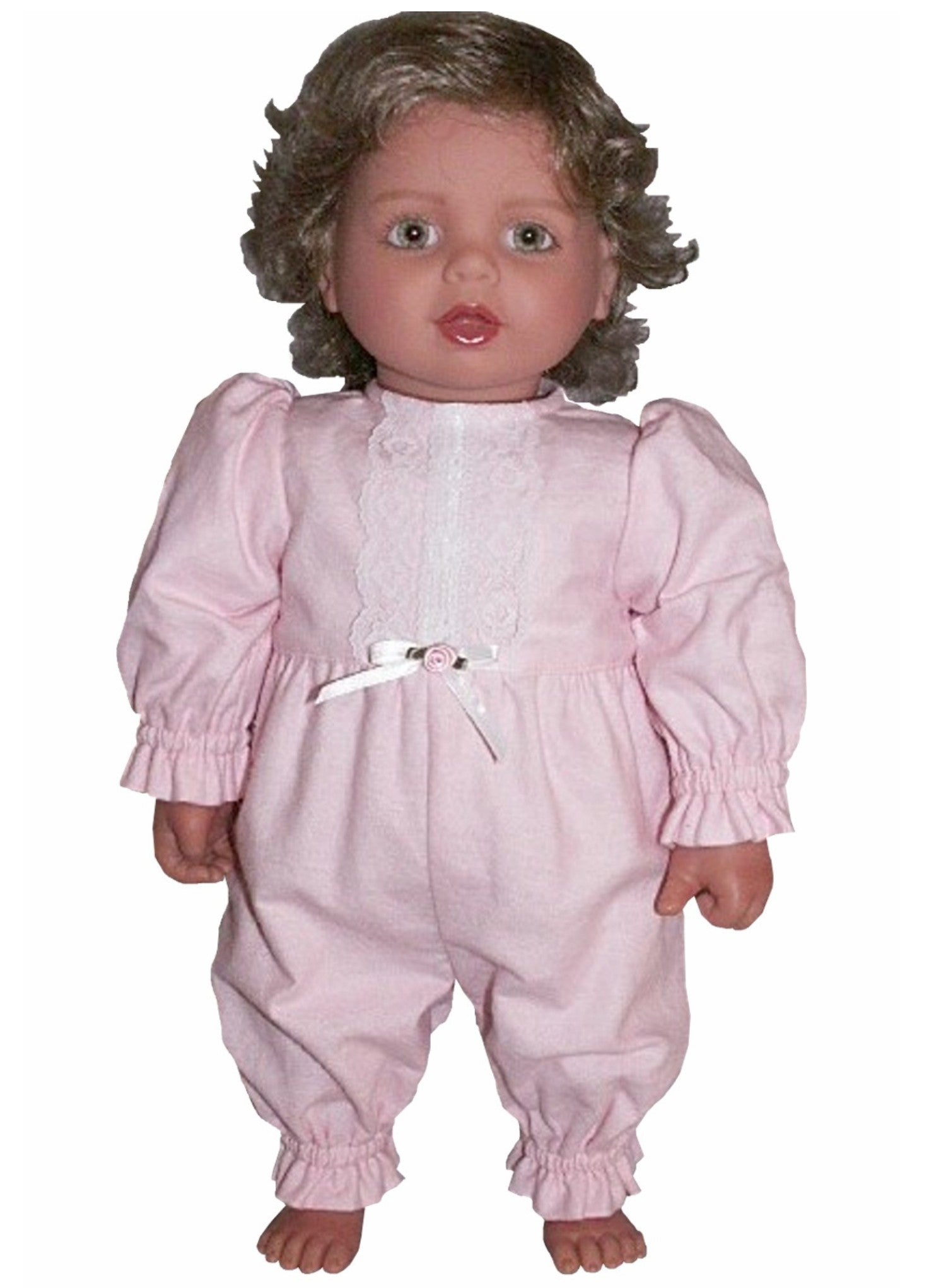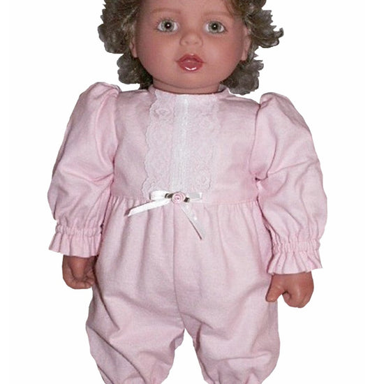Snuggle up in style! These charming one-piece pajamas are designed to fit 20" My Twinn Toddler dolls perfectly. Featuring delicate eyelet lace trim adorning the front bodice and attached gathered pants, they're as cozy as they are cute. Ideal for bedtime playtime or adding to your doll's wardrobe collection.