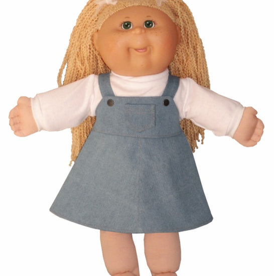 This charming overalls-style jumper brings classic doll fashion to life with authentic details that collectors adore. The front bib pocket adds practical charm, while decorative top-stitching showcases quality craftsmanship throughout. Sturdy metal snaps ensure easy dressing and reliable wear through countless adventures. Perfect for 20" Cabbage Patch Kids dolls, this piece captures the nostalgic appeal of vintage doll clothing with modern durability.