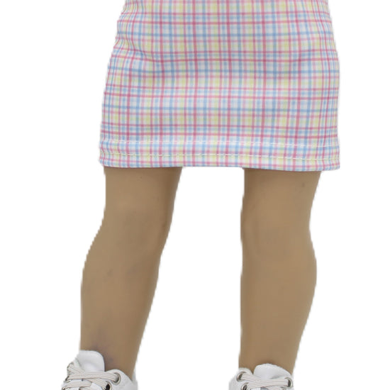 freshen up your doll's closet with this soft pastel plaid miniskirt! Soft knit fabric in pretty shades of pink, blue, and yellow creates a sweet, preppy vibe that's perfect for any occasion. The stretchy elastic waist makes it a cinch to dress your American Girl doll. Layer it with coordinating tops for endless styling possibilities!