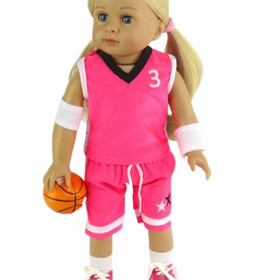 Get your 18" American Girl doll game-ready with this all-in-one Pink Basketball Set! Everything needed for court action is included: a coordinating jersey and shorts, socks, sneakers, hair ties, sweatbands, and an official basketball. Your doll can shoot hoops, join a team, or practice her moves with complete head-to-toe style. One set, endless athletic adventures!