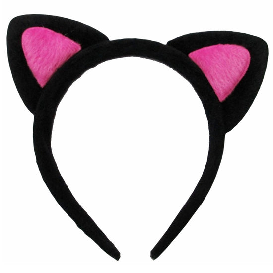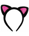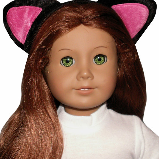 Pink kitty ears on a black headband is made to fit a doll with approx. 12" head circumference.