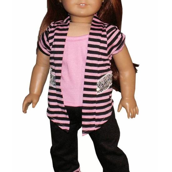 Pink and black stripe top accented with silver sequins is paired with coordinating black knit pants. Top is attached to pink tee and closes in back with Velcro.