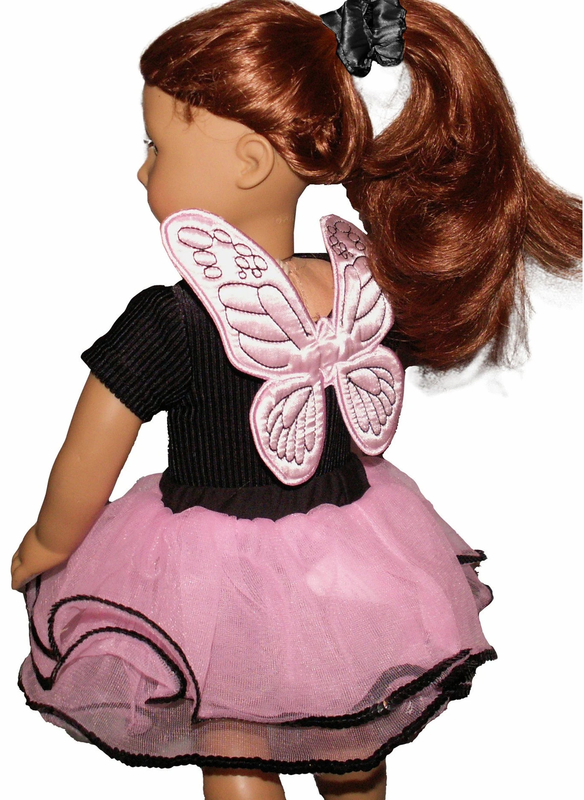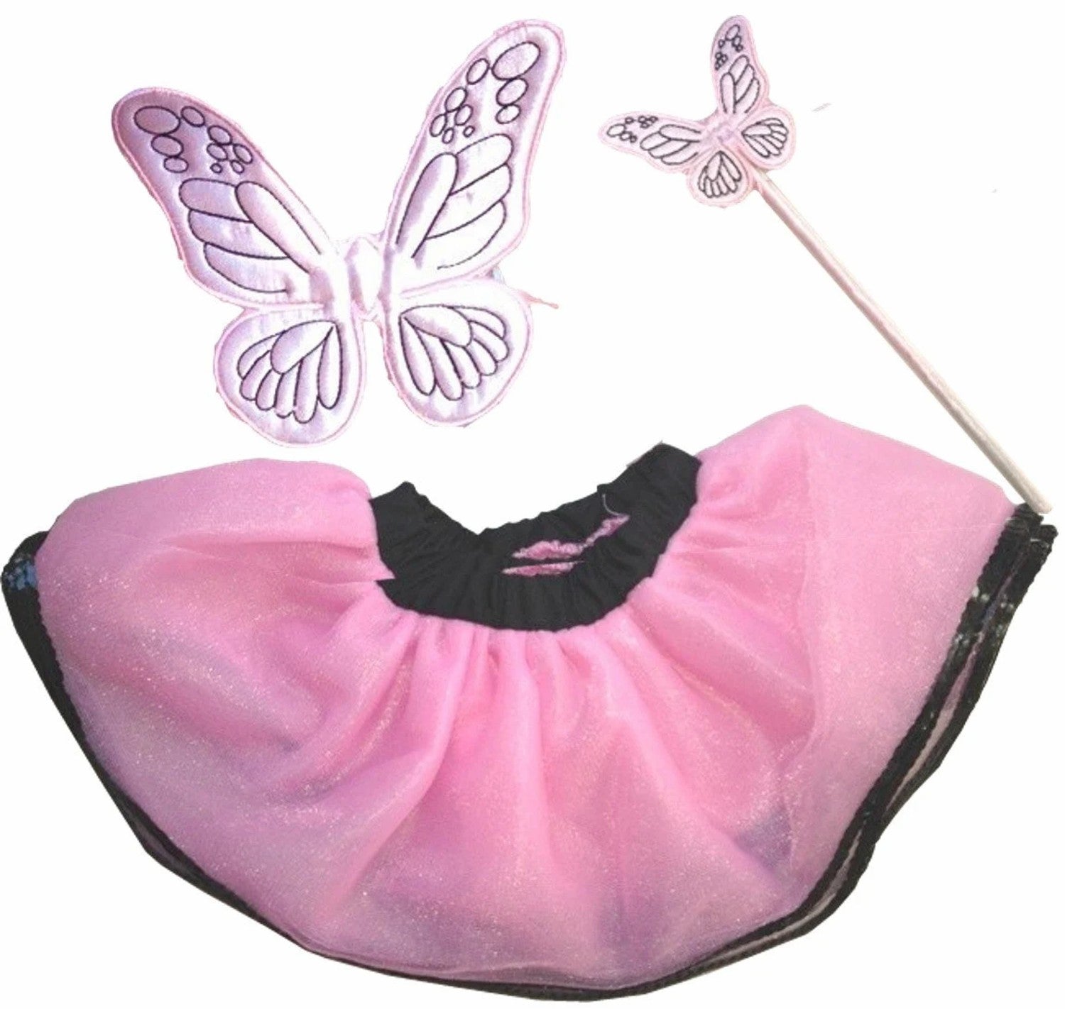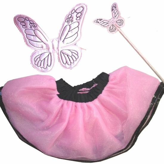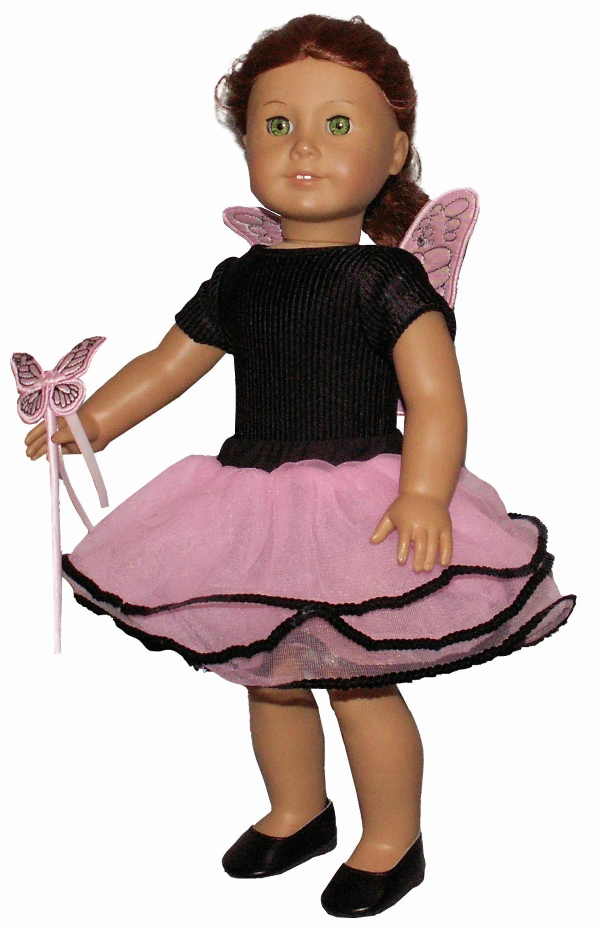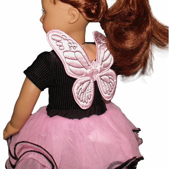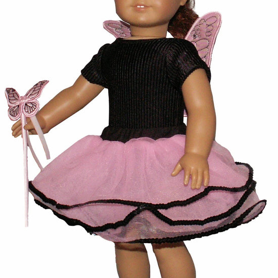 Pink fairy wings, pink tutu with black sequin trim and butterfly wand fits American Girl sized dolls.