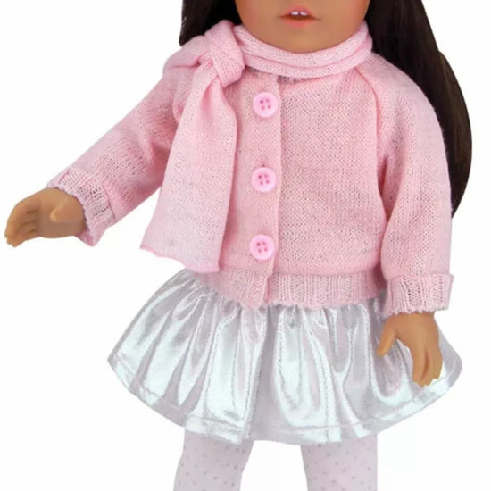 5 piece set comes complete with pastel pink cardigan, scarf, hat, white polka-dot leggings and a fabulous pleated metallic silver skirt.