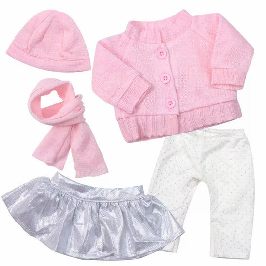 Your 18" American Girl doll will be ready for anything in this fabulous five-piece set! It includes a soft pastel pink cardigan, cozy scarf, adorable hat, white polka-dot leggings, and a show-stopping pleated metallic silver skirt. Mix these pieces together or style them separately for endless outfit combinations. Perfect for playtime adventures or special occasions!