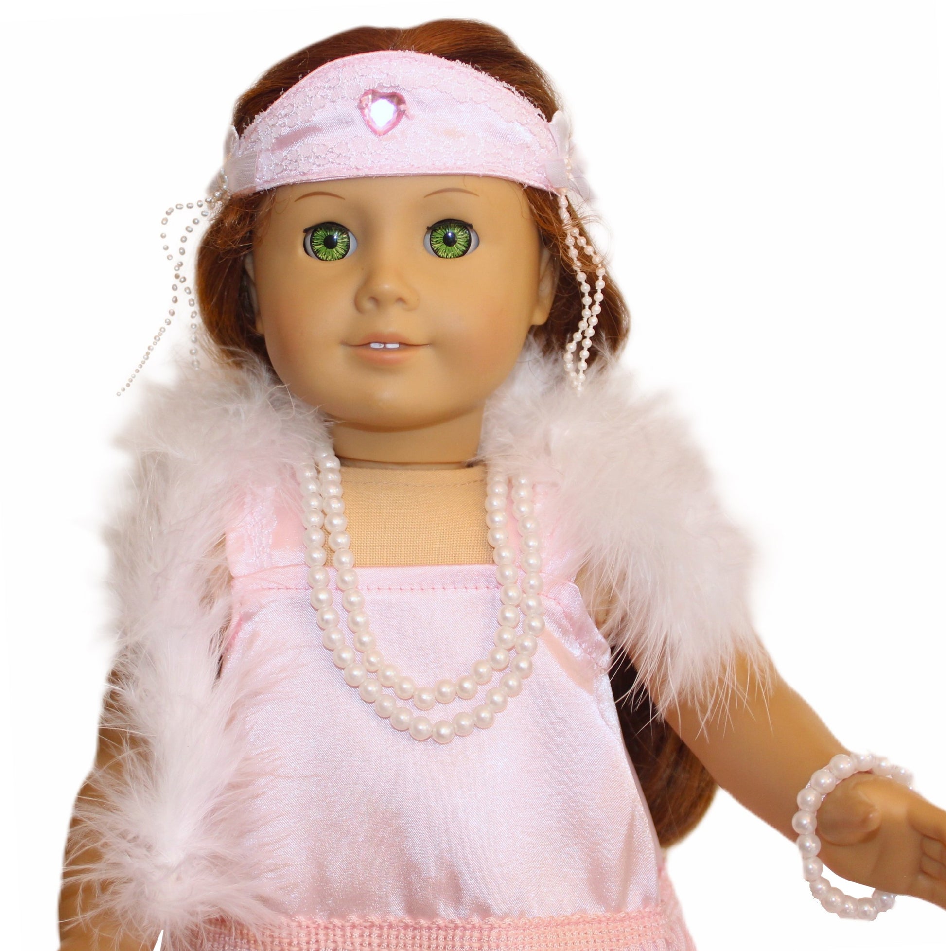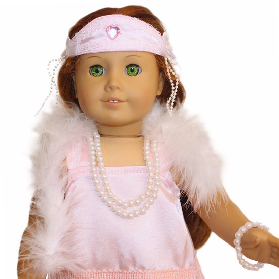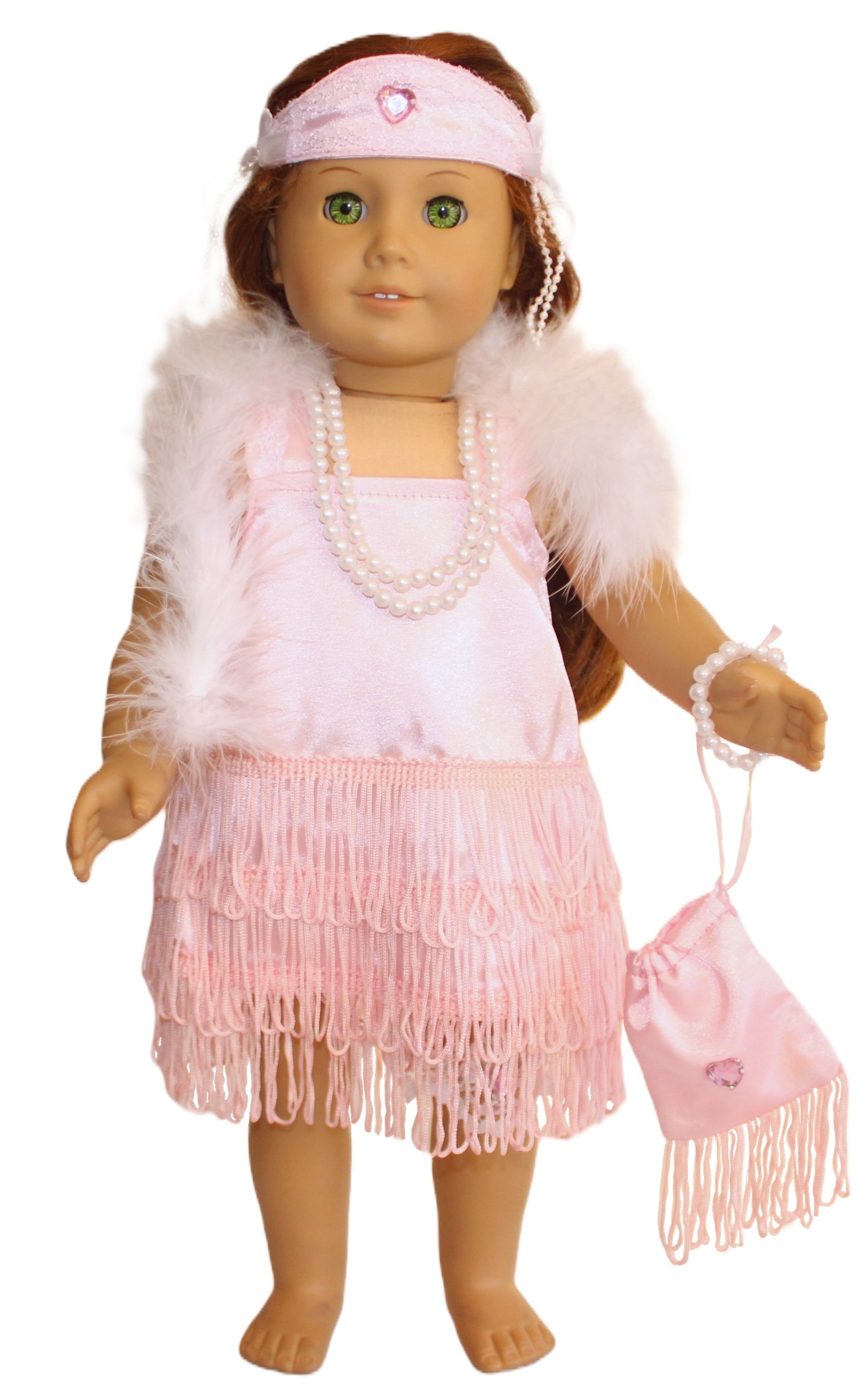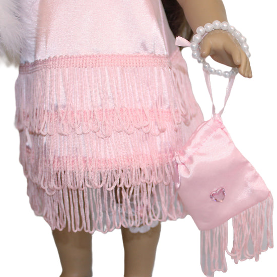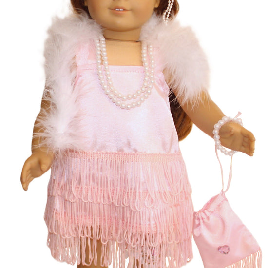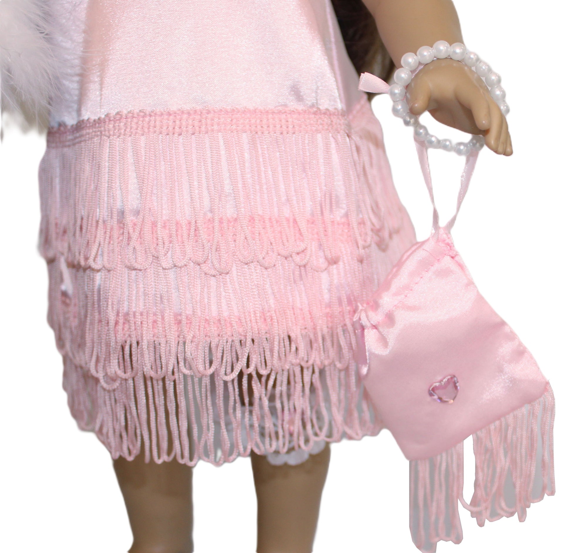 Pink satin flapper dress comes with headpiece, dress, purse, feather boa, bracelet, garter and necklace.