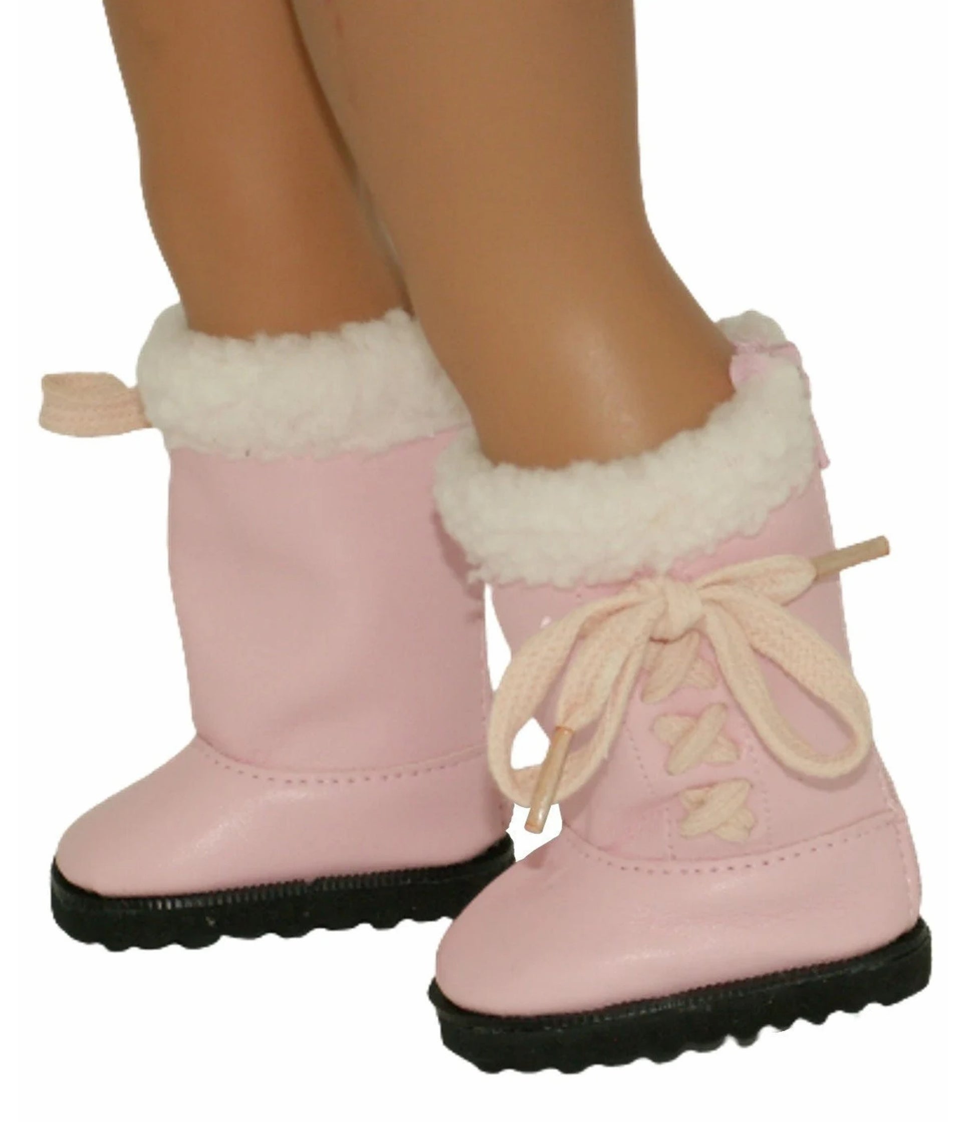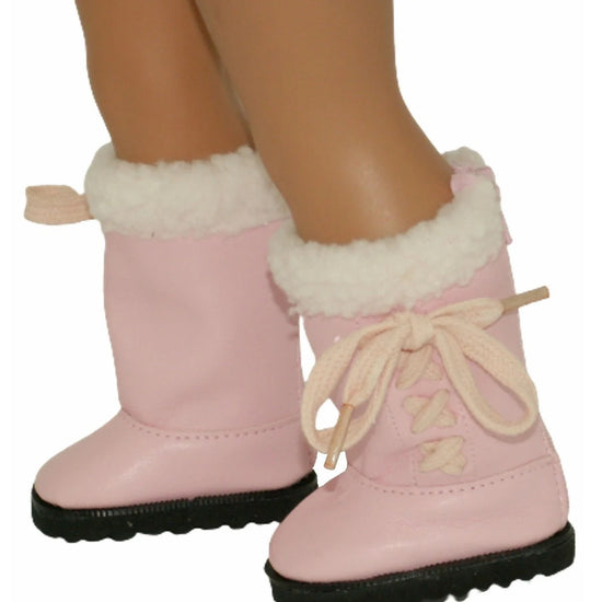 Pink faux leather boots with fleece trim. Boots close with zippers.
