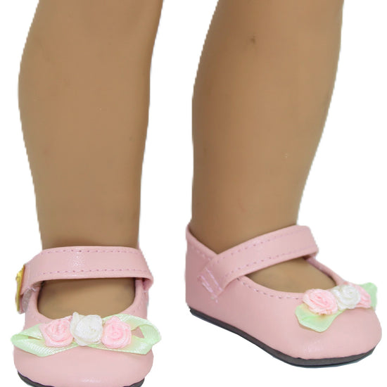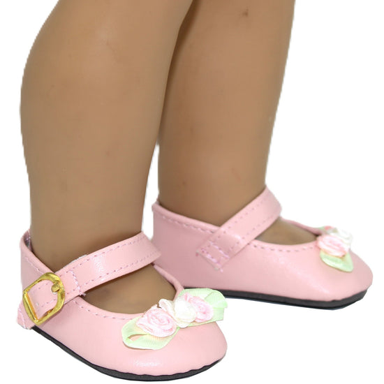 Pink Mary Janes with Rosettes Step into sweetness with these darling pink Mary Janes! Decorated with pretty pastel roses, they're designed to fit 18-inch American Girl dolls perfectly. The classic Mary Jane style brings timeless charm to your doll's shoe collection, while the floral details add a pop of garden-fresh beauty. A must-have for any doll fashionista!