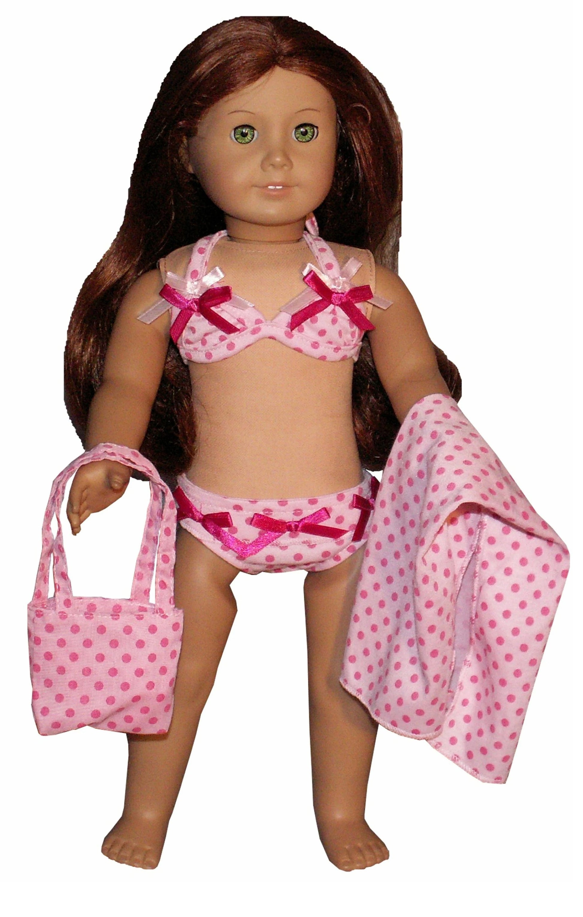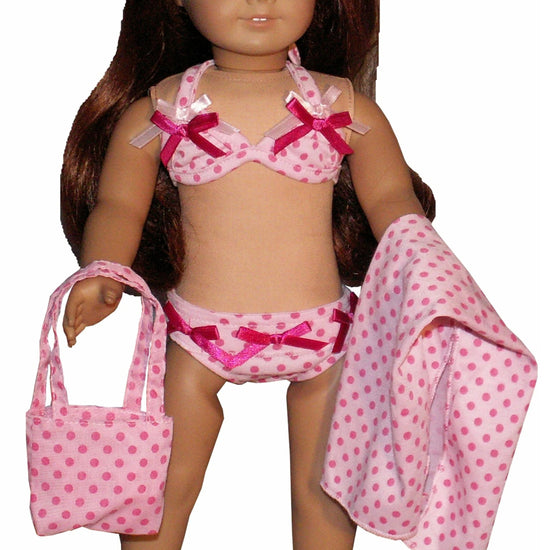 Pink polka dot bikini includes coordinating towel and tote bag.