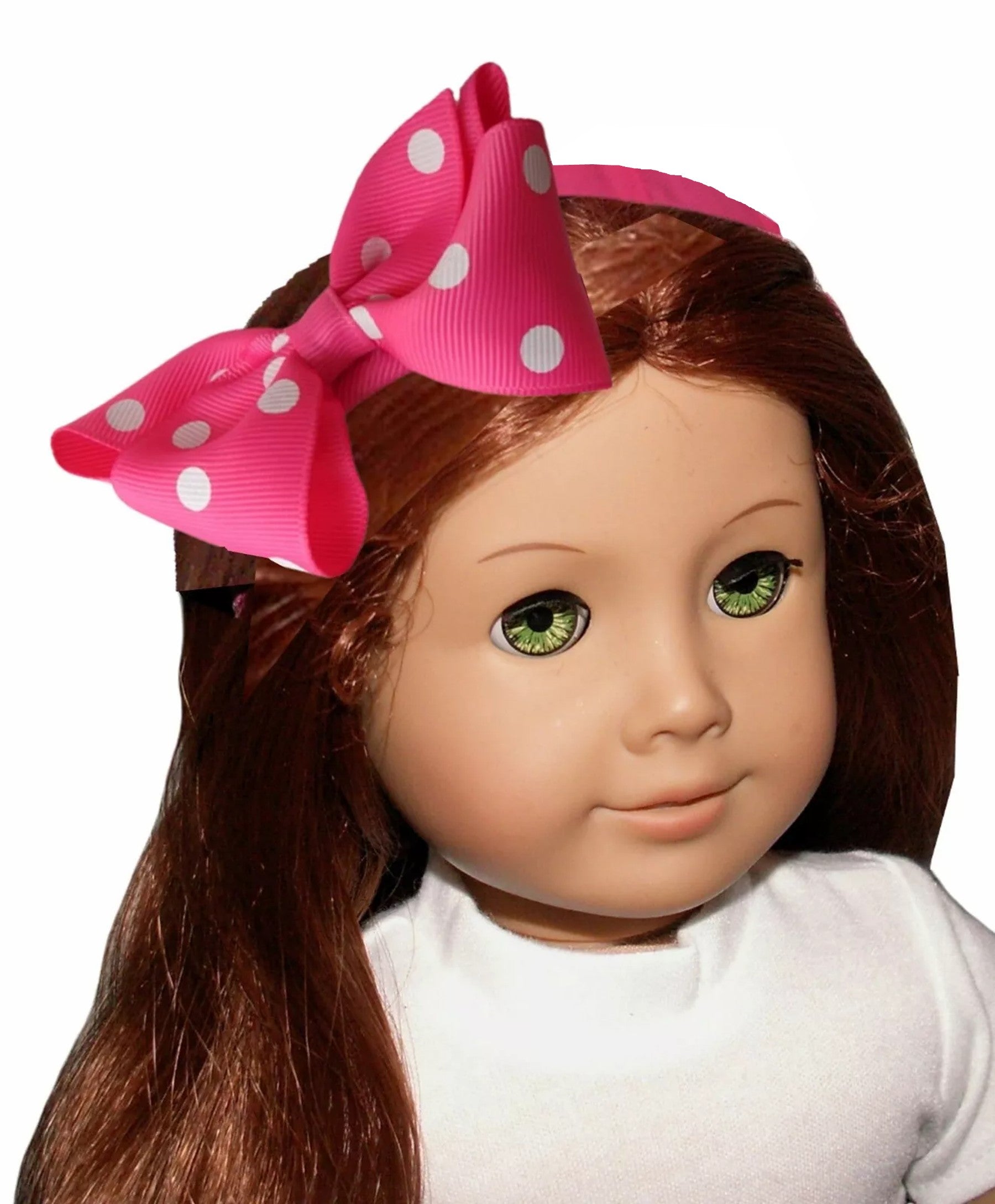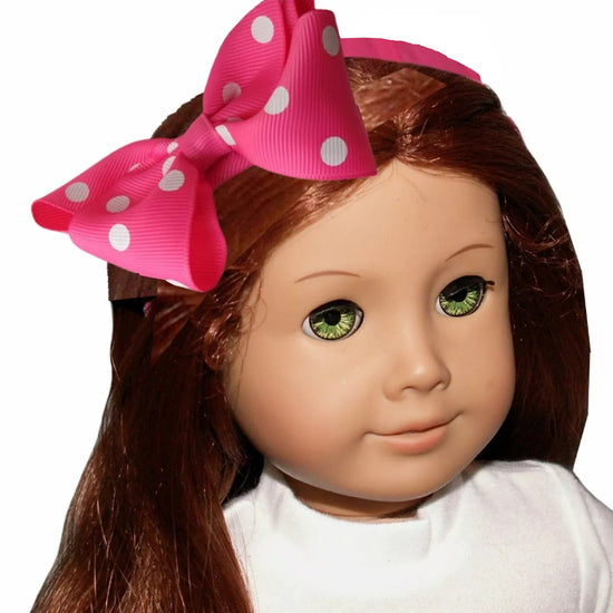Pink and white polka dot ribbon headband is made to fit a doll with approx. 12" head circumference.