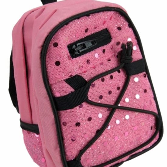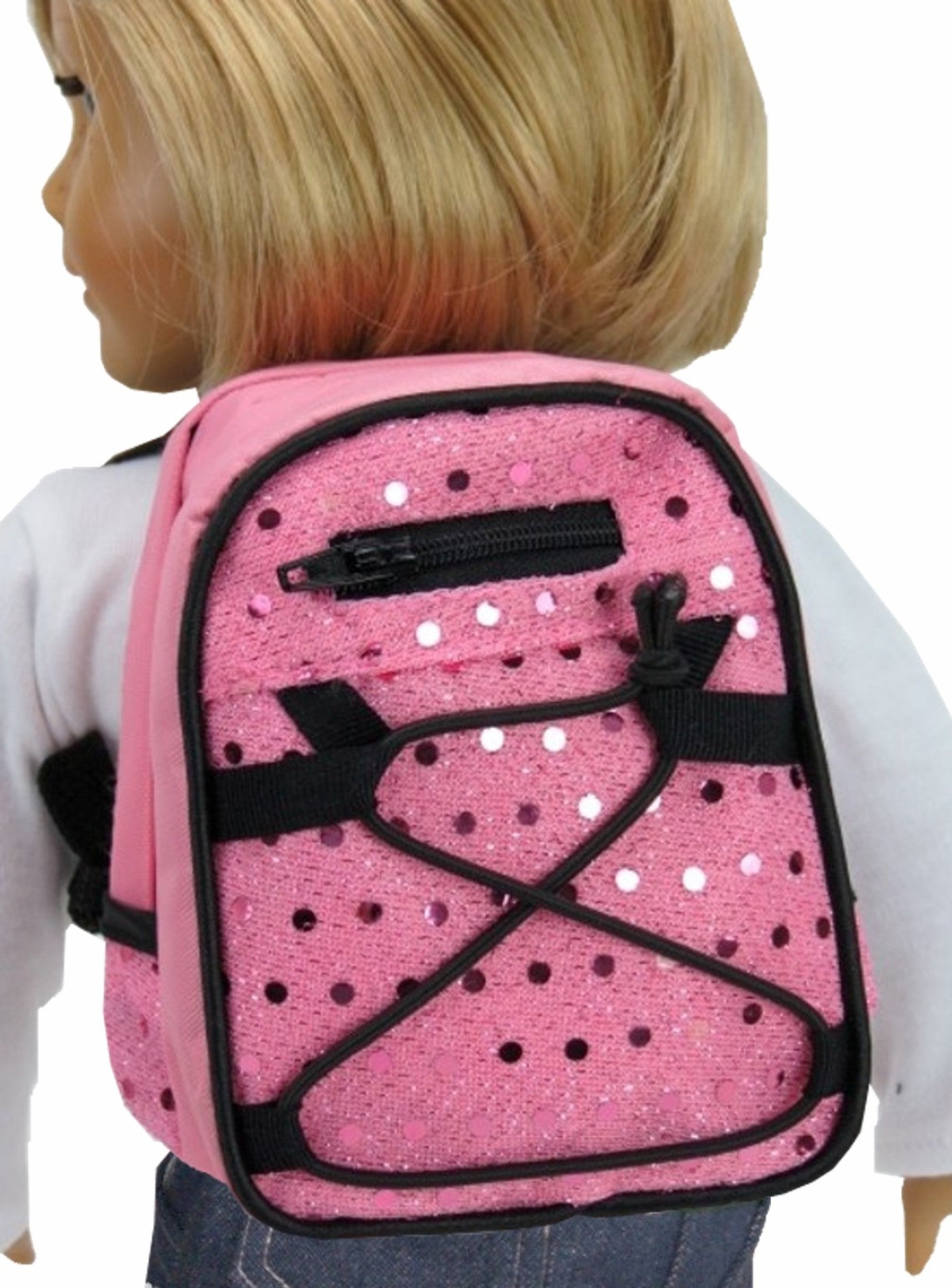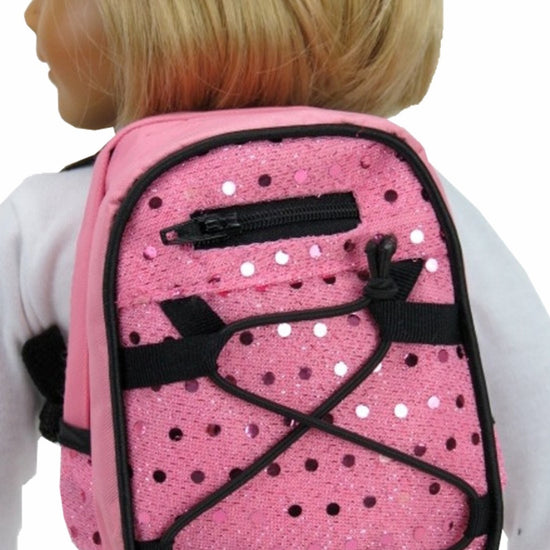 Pink sequin backpack is sized for 15-19" dolls. Great for back to school.