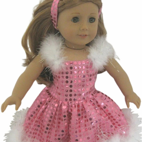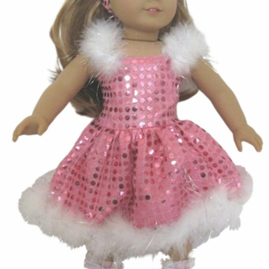 This sparkly pink skating dress dazzles with its shimmering fabric and playful white boa trim. Perfectly complemented by a matching headband and panties, it adds a touch of fun and flair to any doll’s dress-up collection. Let your doll glide into style with this charming outfit!