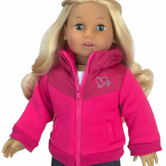 Keep your doll cozy on the slopes with this adorable pink ski jacket! Featuring a soft fleece lining for warmth and an embroidered heart detail on the front, it's the perfect blend of style and comfort. Designed to fit 18" American Girl dolls, this jacket pairs beautifully with winter accessories for complete cold-weather looks. Your doll will be ready for alpine adventures in this charming piece.