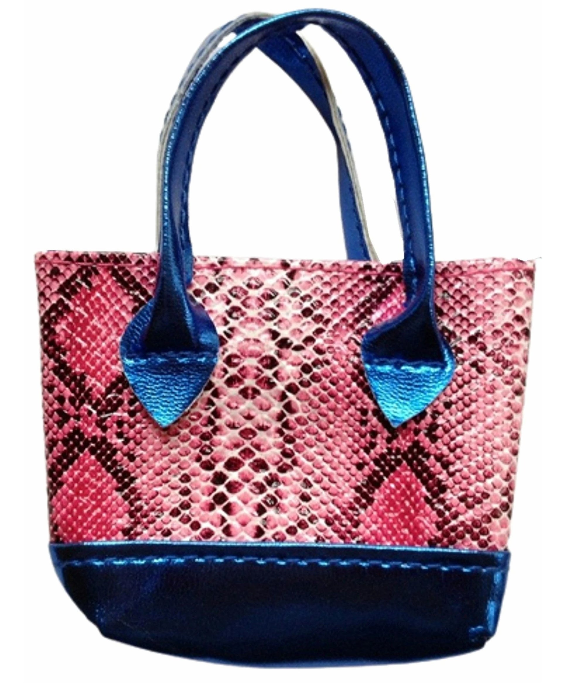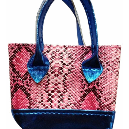 Pink snakeskin vinyl beach tote with dark blue accents is large enough for all your doll's summer needs.