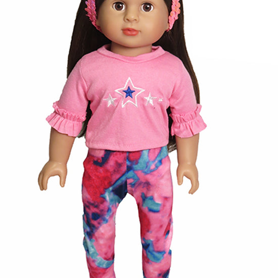 Dress your 18" American Girl size doll in celestial style with this charming two-piece set. The pink top features delightfully ruffled sleeves and a whimsical star design that catches the light, while the coordinating multicolored leggings add a pop of fun. Perfect for playtime adventures and doll styling that sparks imagination.