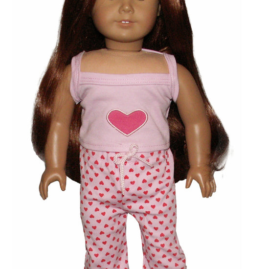Pink knit pullover camisole with embroidered heart and pink heart print pajama bottoms.