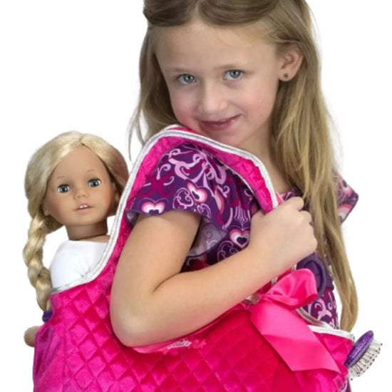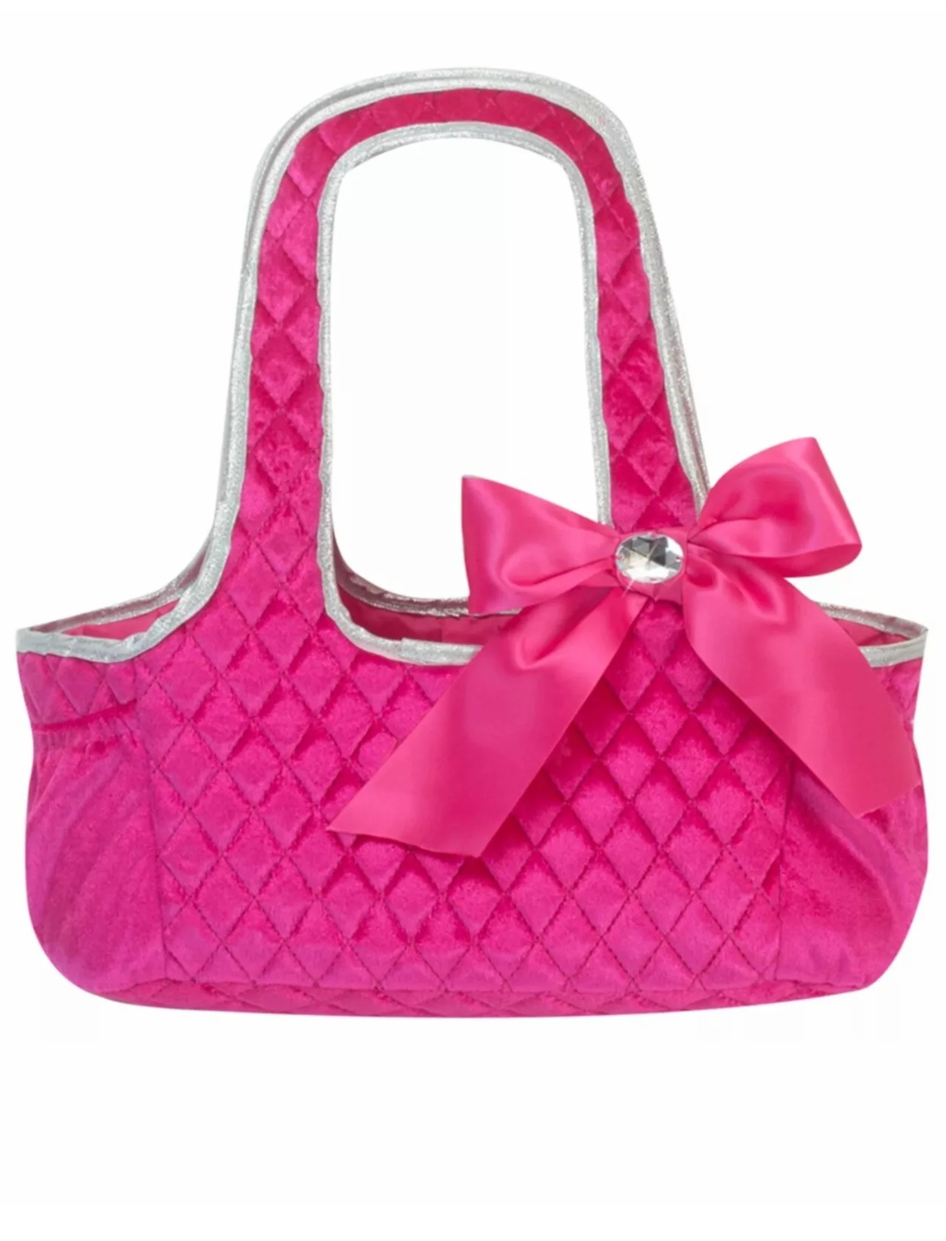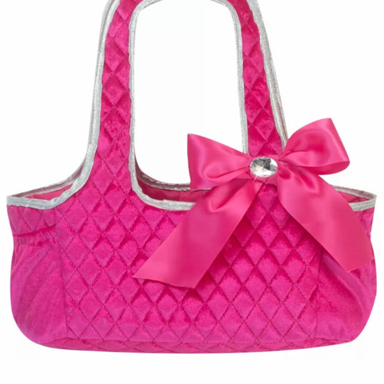 Hot pink quilted velour, glittery silver trim and large bow with silver jewel make this a luxurious way to travel!