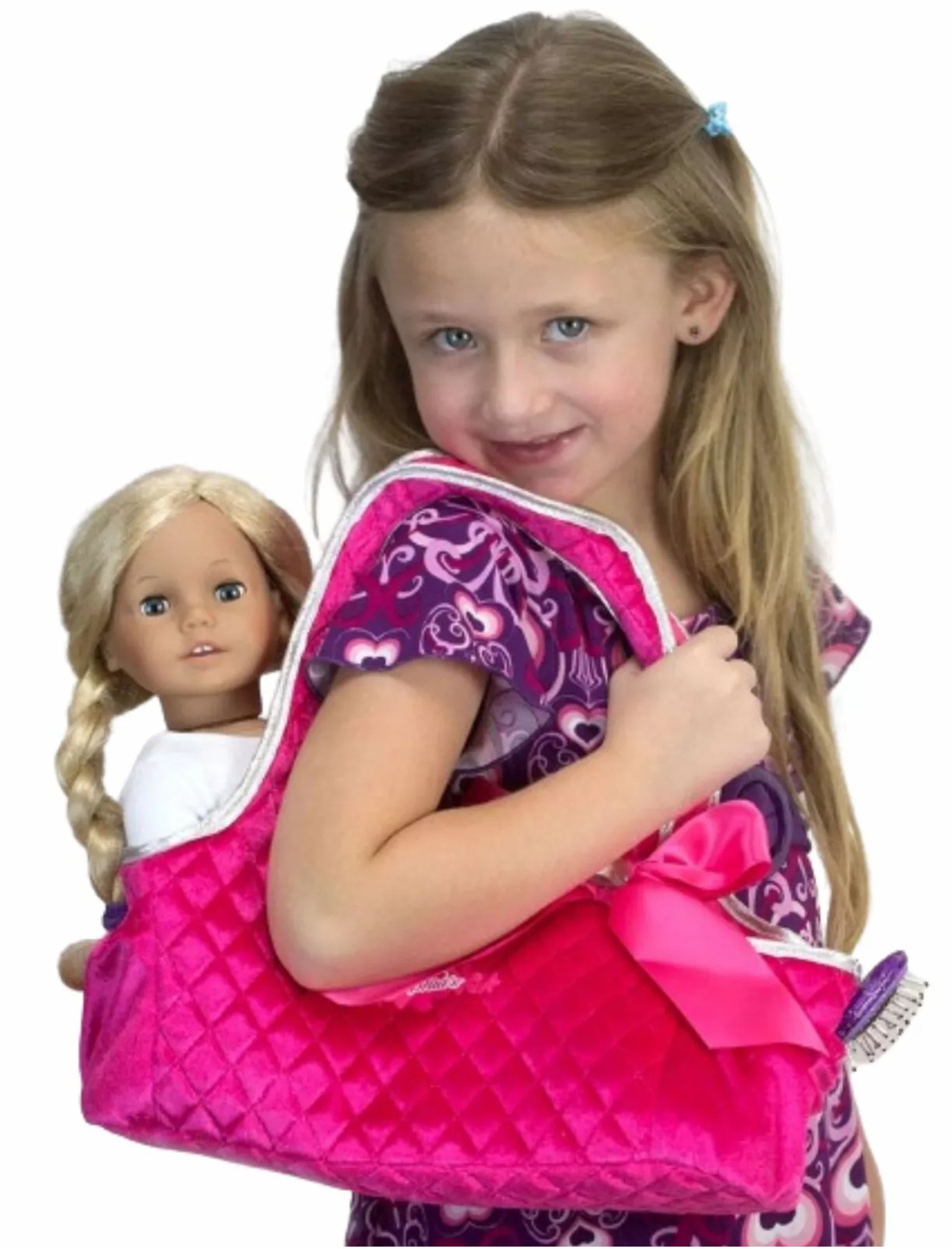 Two side pockets with elastic hems safely store dolly's accessories like hairbrushes, bottles, sunglasses and more.