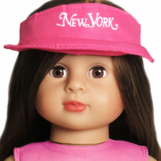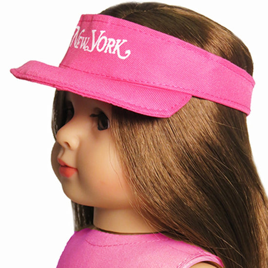This pink "New York" golf visor fits dolls with approximately a 12-inch head circumference. It's a stylish accessory that adds a sporty look to your doll's outfit while keeping the sun out of their eyes.