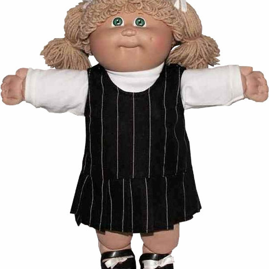 This charming jumper brings vintage doll fashion to life with a crisp pleated skirt that captures classic 90s style. The back Velcro closure makes dressing your 16" Cabbage Patch Kid a breeze—no fussy snaps or buttons needed. Perfect for creating adorable outfits that celebrate the nostalgia and charm of these beloved dolls.