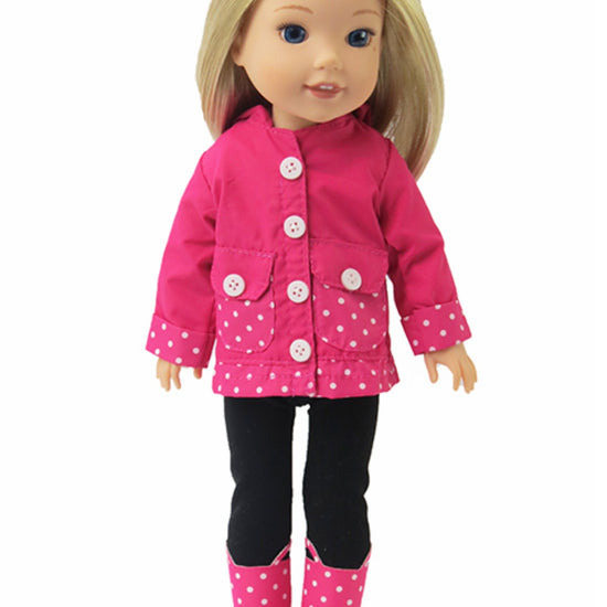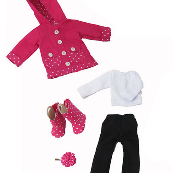 Dress your 14" WellieWishers doll for rainy day adventures with this cheerful 4-piece set. Featuring a pink polka dot raincoat, white top and black pants, a cute hairclip, and pink boots, it adds fun and flair while keeping your doll cozy and dry. Perfect for playful weather-inspired stories!