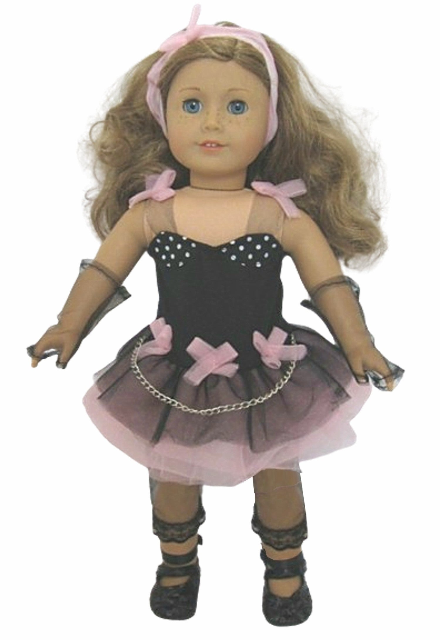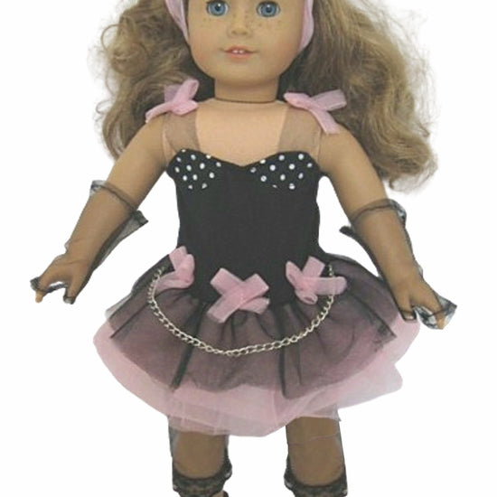 Punk rock set includes dress with layers of tulle, a dangling chain, lace leggings, lace gloves and headband.