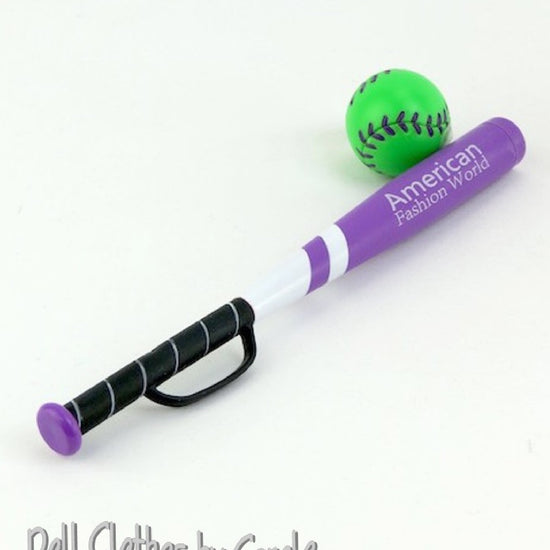 Purple baseball or softball bat and green ball. Bat measures 8 1/2" long.