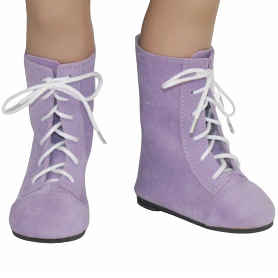 These lavender purple faux suede boots with laces add a fun and stylish touch to your My Twinn dolls. Designed for a perfect fit, they make dressing up your dolls easy and adorable. Let your doll step out in playful fashion with these charming boots!