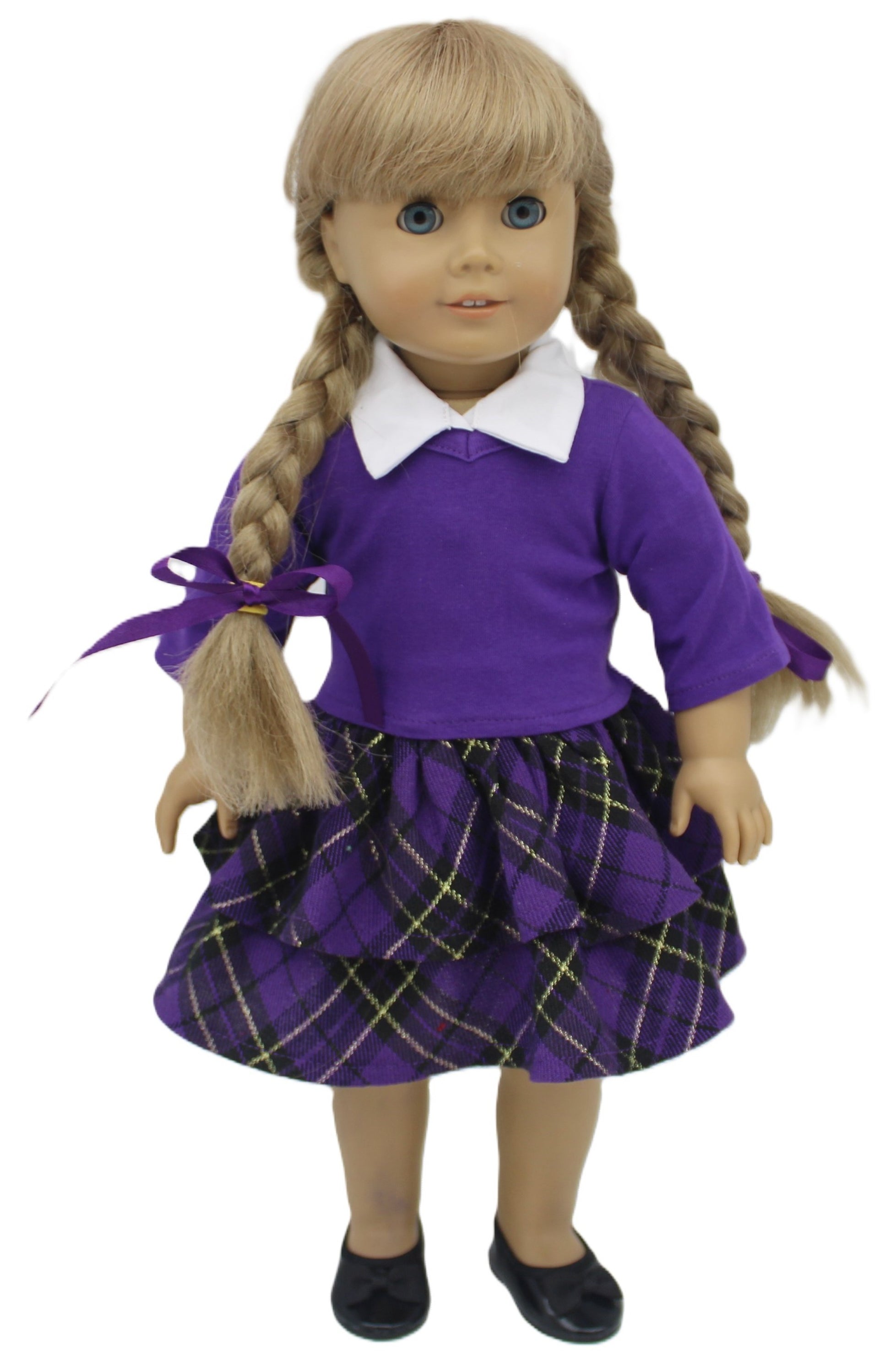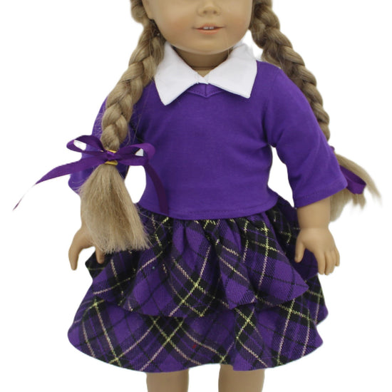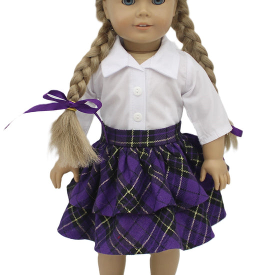 Purple plaid skirt, white long sleeve shirt, and a purple vee neck knit top to go over the blouse.