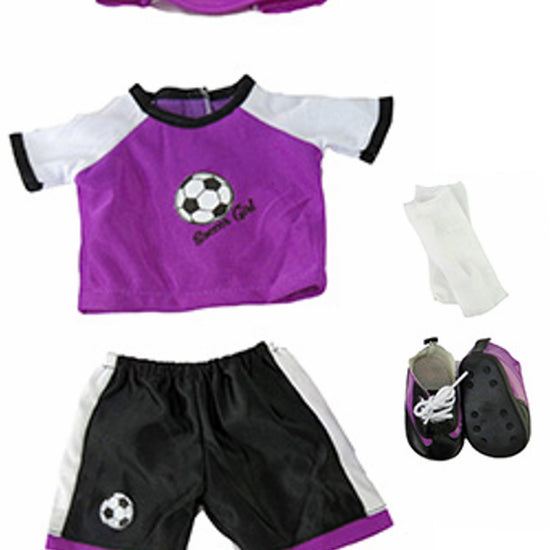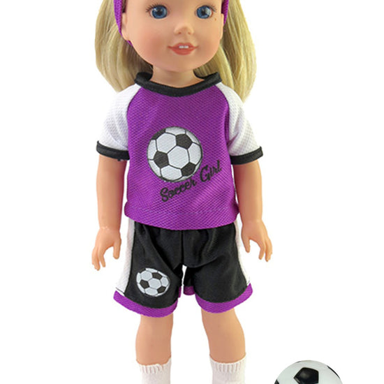 Score big with this vibrant purple soccer set designed for 14.5-inch dolls like WellieWishers. This six-piece collection includes everything your doll needs to hit the field: a sporty jersey, matching shorts, socks, cleats, a headband for game day, and a soccer ball for practice. Whether your doll is a soccer star or just loves athletic style, this complete outfit brings action-packed fun to playtime and makes the perfect gift for young collectors who love sports and adventure.