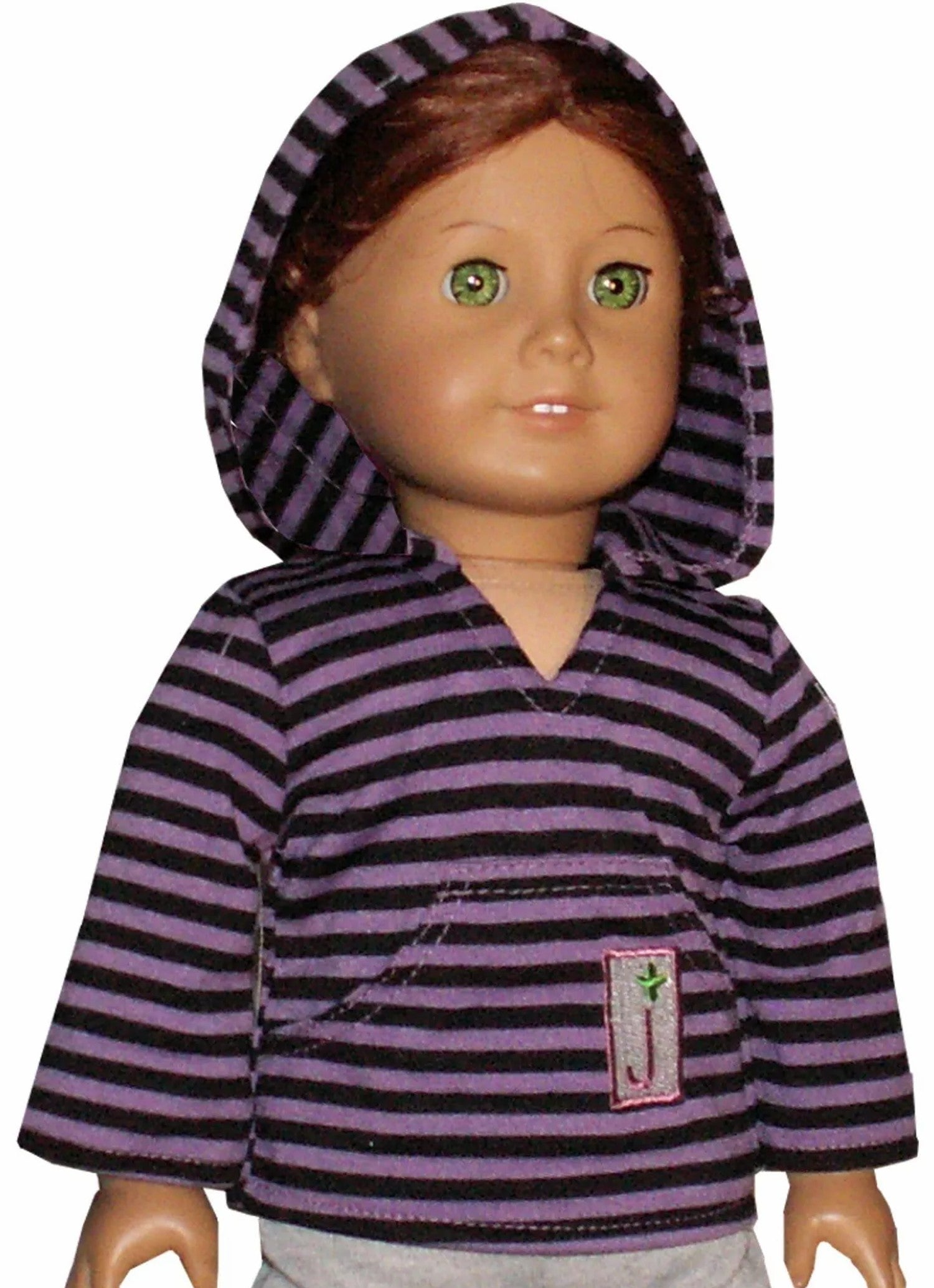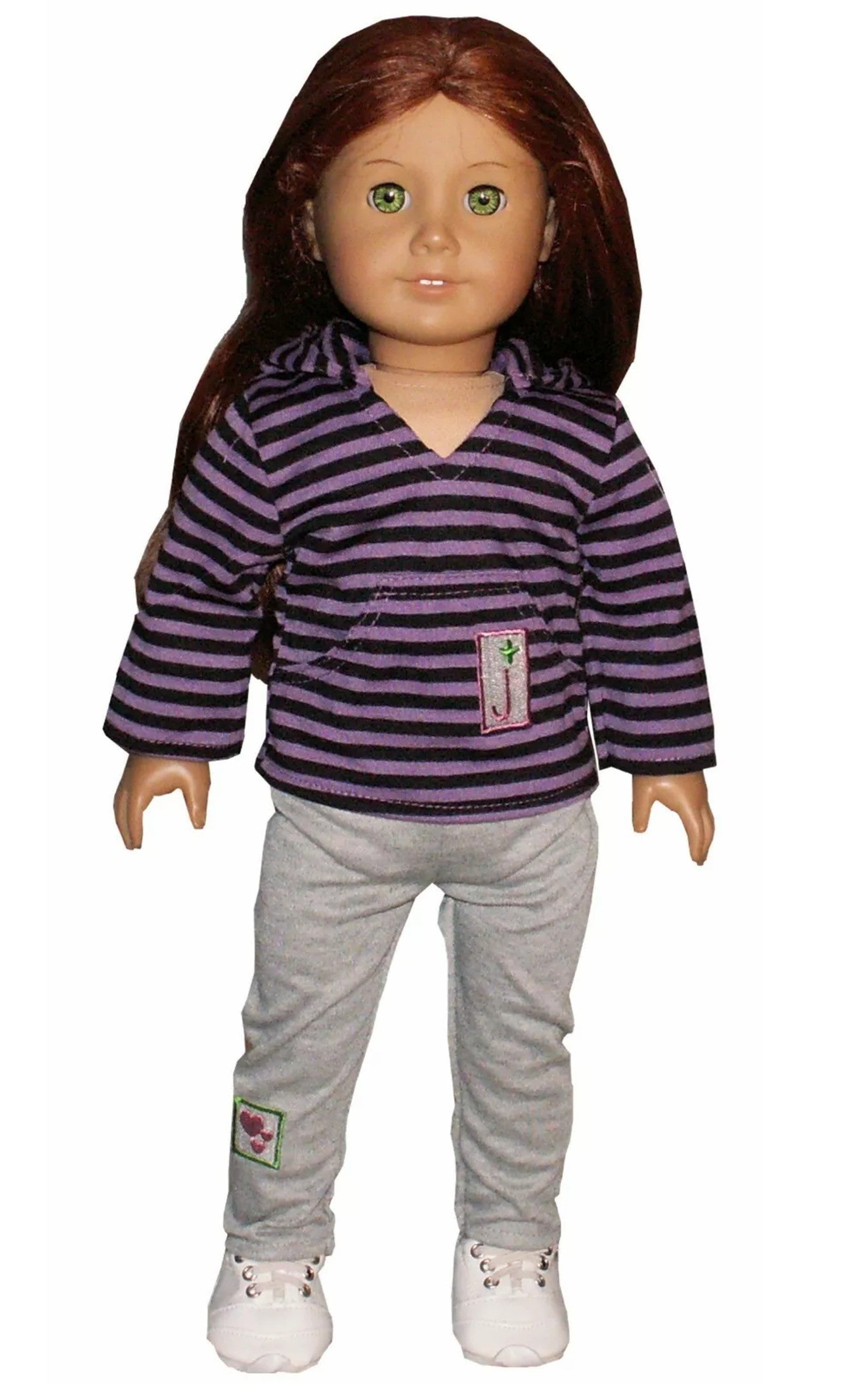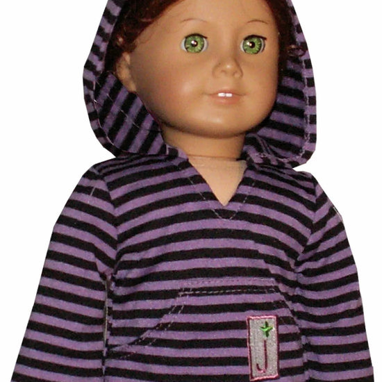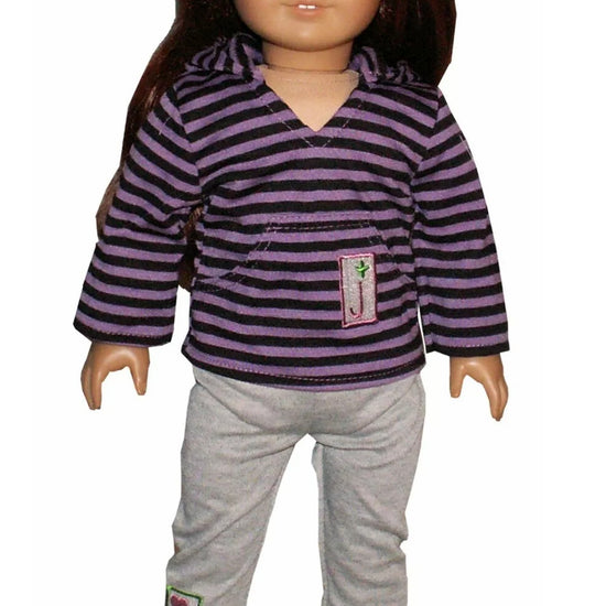 Purple and black stripe hoodie is paired with coordinating gray knit pants. Hoodie closes in back with Velcro.