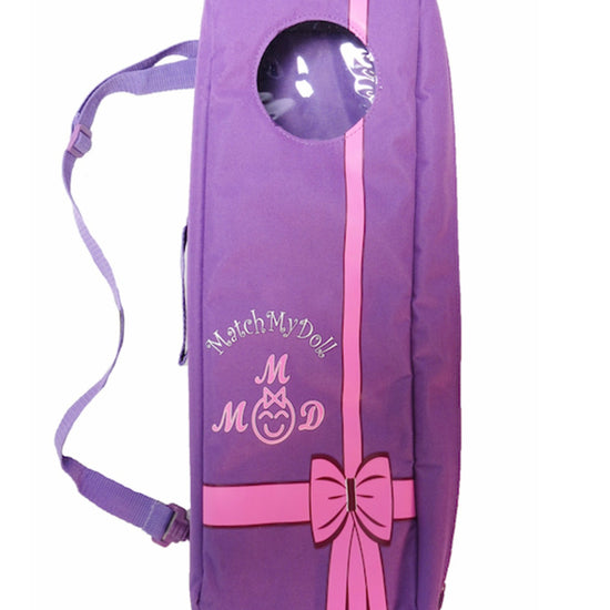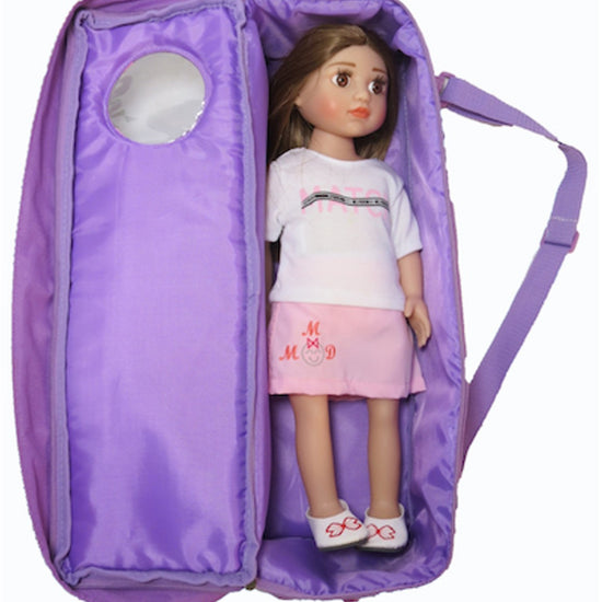 Purple travel tote sized for 16-18" dolls such as American Girl, Bitty Baby, Magic Attic, Kidz n' Cats & Carpatina.