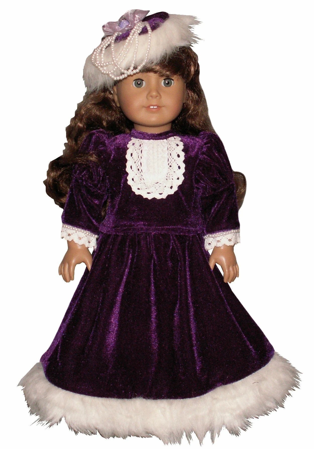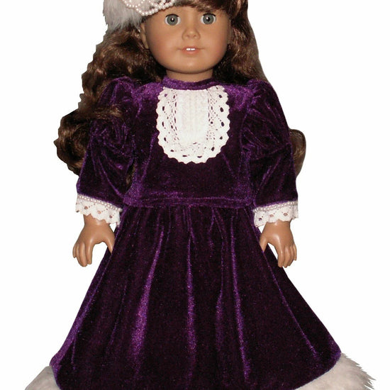 Purple Victorian velvet top and skirt with matching hat is accented with pearls.