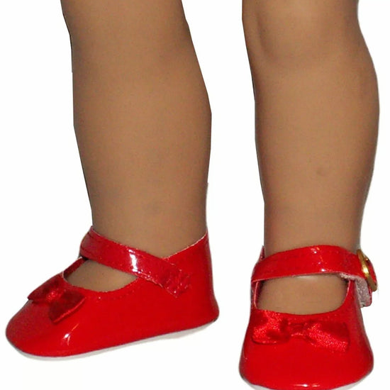 Red Patent Leather Mary Janes with classic red bows and secure Velcro closure. The glossy faux patent leather finish adds a polished, dressy look perfect for special occasions or everyday doll fashion. Easy on and off with reliable Velcro fastening. A versatile essential that pairs beautifully with dresses, skirts, and outfits across any doll's wardrobe. Fits American Girl and similar 18-inch dolls.